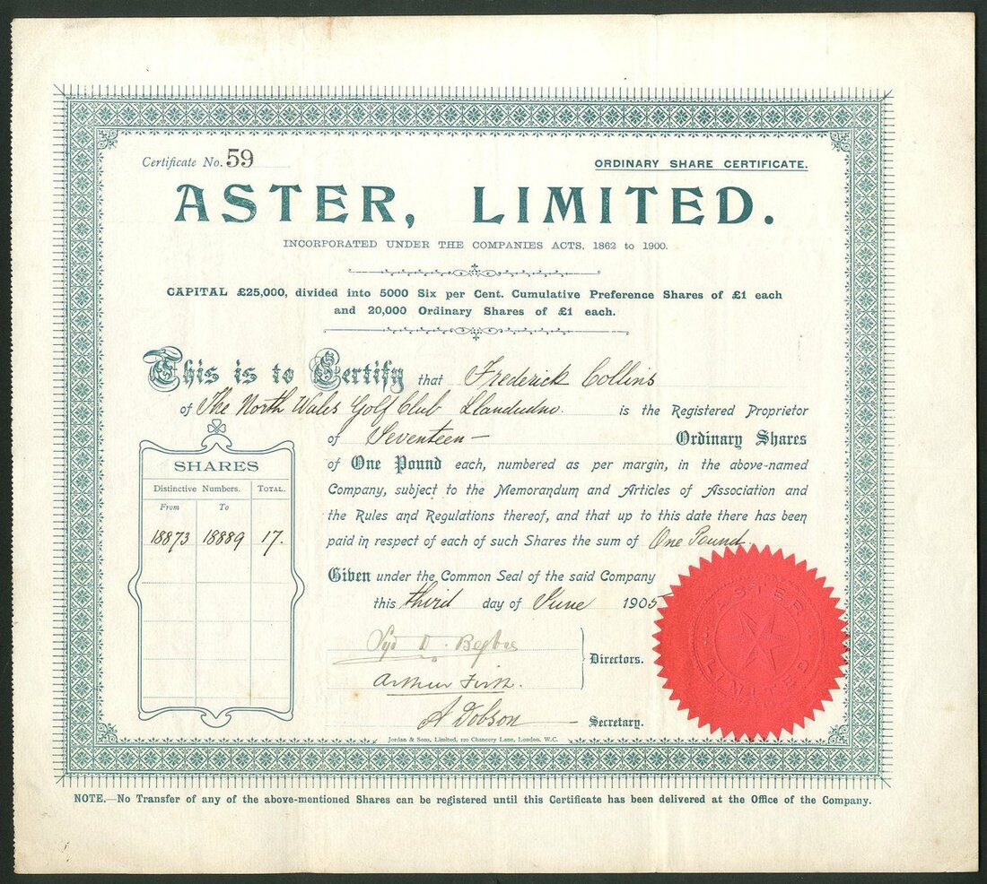 Great Britain: Aster Limited, £1 ordinary shares, 190[5], #59, signed by Sydney Begbie as director, ornate border, green, red seal. The company were licence holders for the French Aster motor car presumably for both sales and also manufacture as a range of British Aster cars were exhibited at the Motor Show between 1905 and 1907. Aster engines were also supplied to many other makes. Begbie Manufacturing Company in Wembley originally held the licence for the engines in 1899. VF and rare.