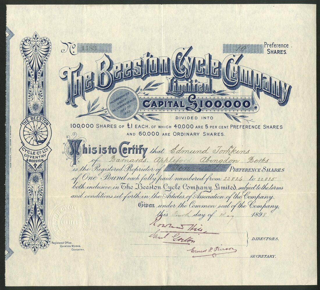 Great Britain: Beeston Cycle Company Limited, £1 preference shares, 189[8], #1183, scrollwork at left, blue. The company was a restructuring of the New Beeston Cycle Company which produced cycles and motor cycles from its works in Coventry and Beeston. One of the Harry Lawson companies which exploited hundreds of motor patents incuding Daimler. Also made motor cars from 1898 but these were soon to be hived off to a newly formed Beeston Motor Company Ltd. Lot comes with a prospectus and a letter from the New Beeston Cycle. GVF and rare.
