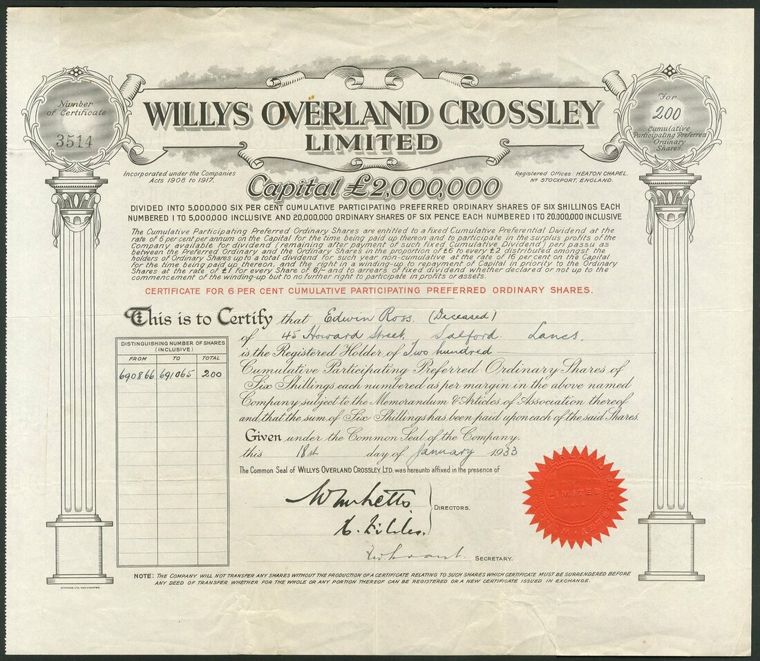Great Britain: Willys Overland Crossley Limited, 6% Cumulative Participating Preferred Ordinary shares, 19[33], #3514, large format piece with Corinthian columns at each side, black and red, red seal.  A company jointly owned by American car and jeep manufacturer Willys Overland and Crossley Motors to produce cars, buses and trucks from an old aircraft factory sold in Stockport, Cheshire. The company was losing money at the end of the 1920's and finally closed in 1934. GVF and scarce. Most of those seen are in rather poor condition.