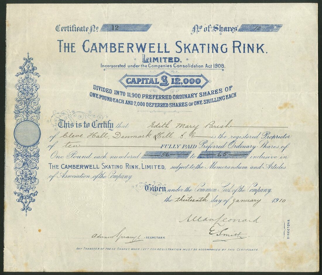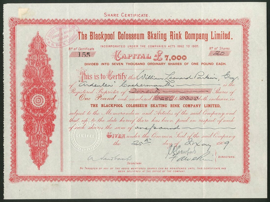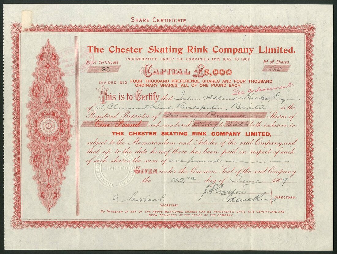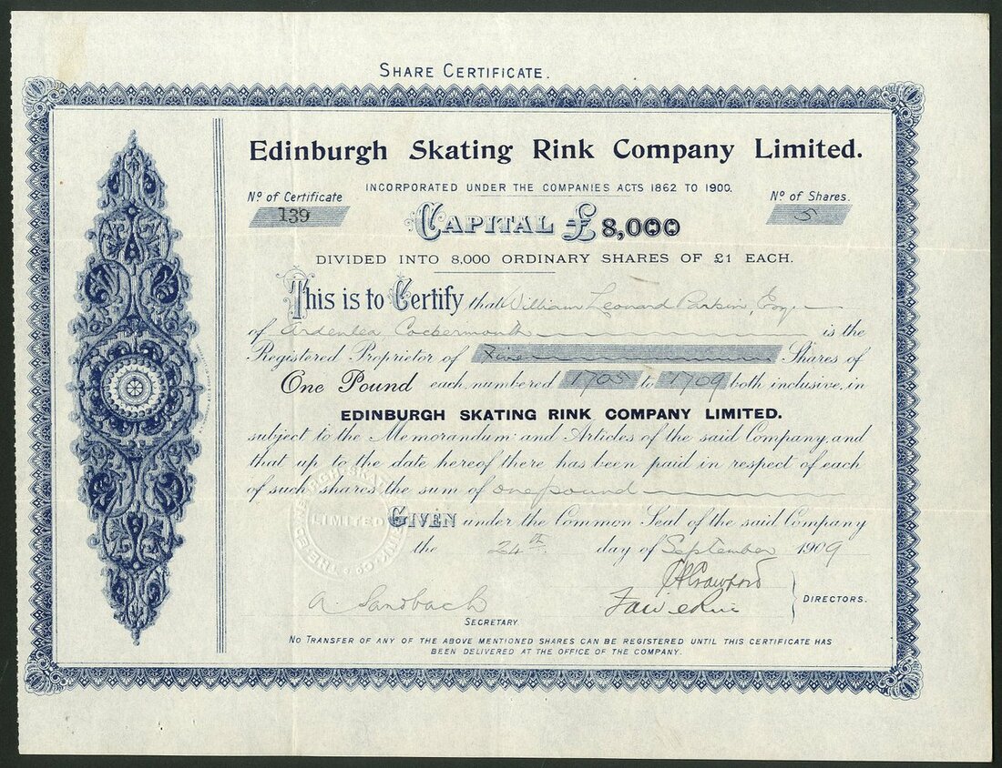 Great Britain: A fine collection of Roller Skating Rink companies, comprising Handsworth Skating Rinks Company Limited, 187[7]; American Roller Rink (Northampton) Ltd., 19[09]; Blackpool Colosseum Skating Rink Co. Ltd., 190[9]; Camberwell Skating Rink Ltd., 19[10]; Chester Skating Rink Co. Ltd., 190[9]; Croydon Skating Rink Co. Ltd., 19[09]; Edinburgh Skating Rink Co. Ltd., 190[9], and, Folkestone and District Rink Ltd., 190[10]. The second with a couple of small edge tears, otherwise VF and better. All rare (8).