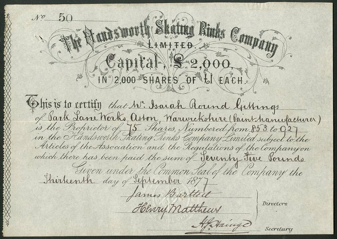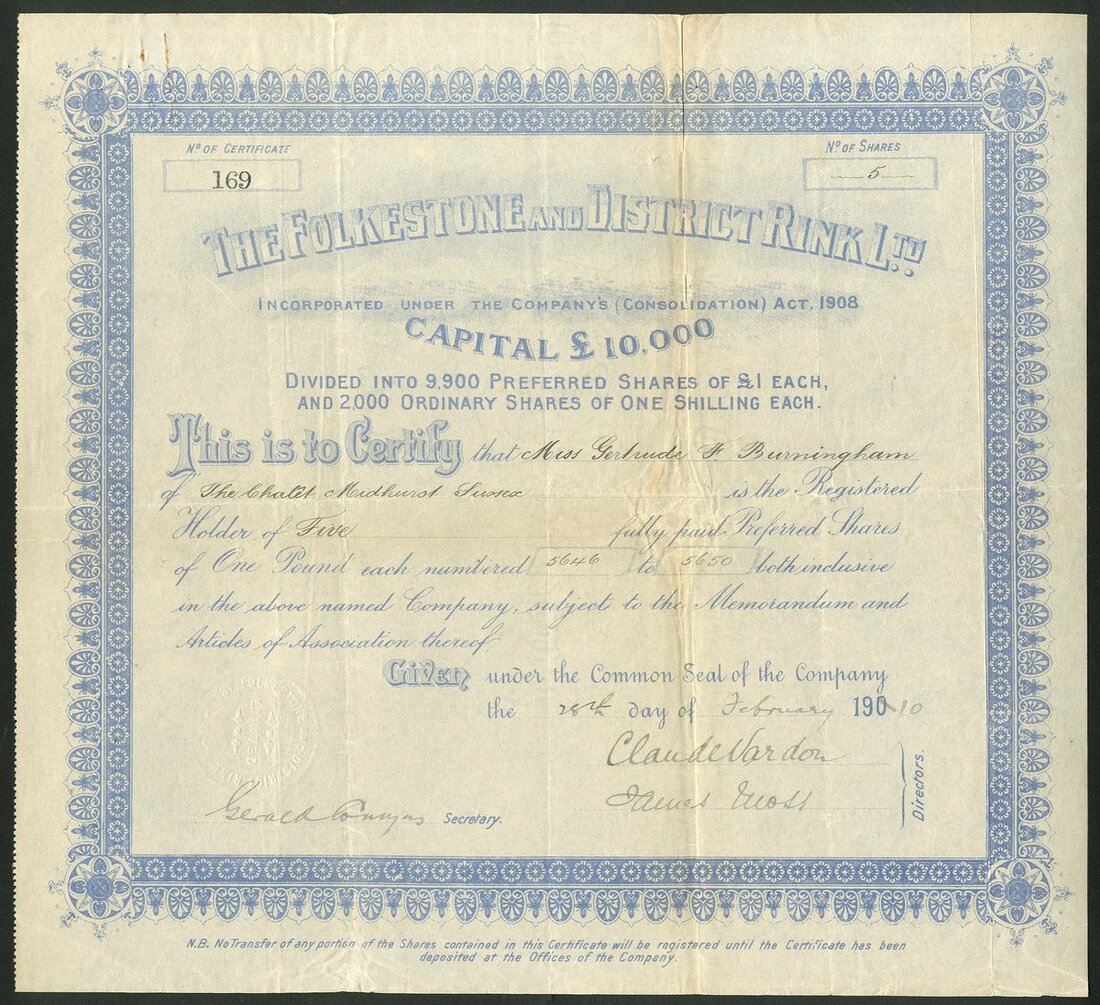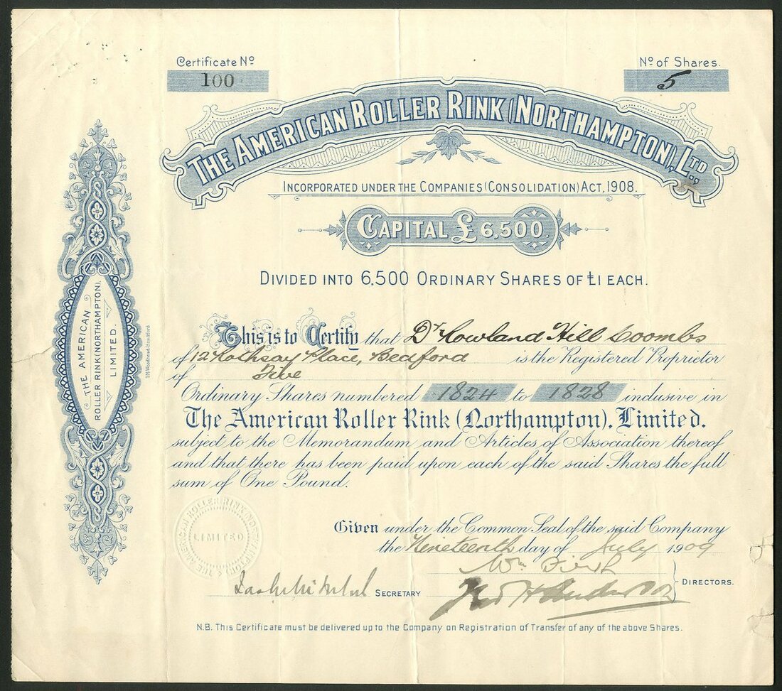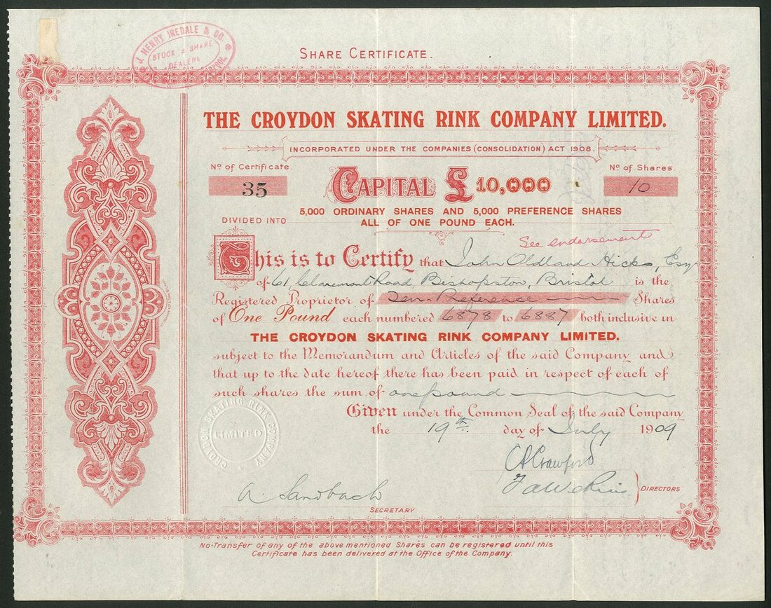 Great Britain: A fine collection of Roller Skating Rink companies, comprising Handsworth Skating Rinks Company Limited, 187[7]; American Roller Rink (Northampton) Ltd., 19[09]; Blackpool Colosseum Skating Rink Co. Ltd., 190[9]; Camberwell Skating Rink Ltd., 19[10]; Chester Skating Rink Co. Ltd., 190[9]; Croydon Skating Rink Co. Ltd., 19[09]; Edinburgh Skating Rink Co. Ltd., 190[9], and, Folkestone and District Rink Ltd., 190[10]. The second with a couple of small edge tears, otherwise VF and better. All rare (8).
