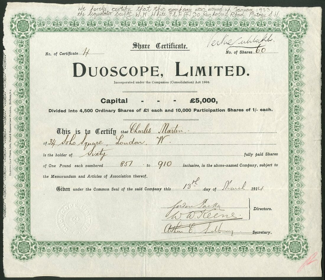 Great Britain: Duoscope Ltd., £1 shares, fully paid, 191(4), #4, ornate border, green and black. Manufacturers of movie cameras. Slightly uneven left edge, liquidators endorsement in top margin, GVF.