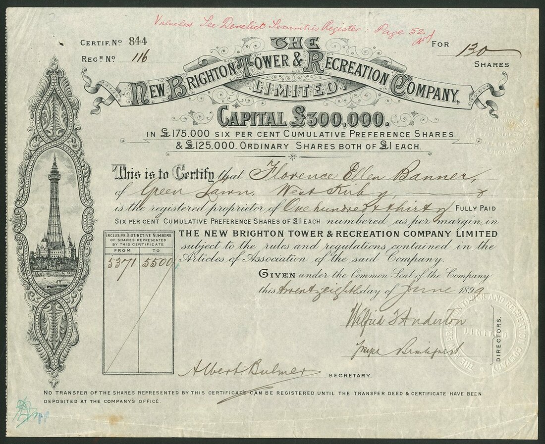 Great Britain: New Brighton Tower & Recreation Co. Ltd. 6% cumulative preference shares of £1, 189[9], #844, vignette of tower at left, black. The company built a large steel tower modelled on the Eiffel Tower in Paris together with a theatre, ballroom, sports stadium and gardens and was opened in 1900. The tower was the tallest building in the country at the time. From the outset it attracted thousands of visitors and there were many extra attractions. Buffalo Bill's Wild West Show was there for 6 months in 1908. Visitors were prohibited from going up the tower during the First World War and the structure suffered from serious neglect. The tower was taken down in the 1920's leaving just the ballroom, theatre and stadium. These were finally destroyed by fire in 1969 and the site cleared and re-used. We sold this piece in 2010 at £110. Endorsement at top, VF and very rare.