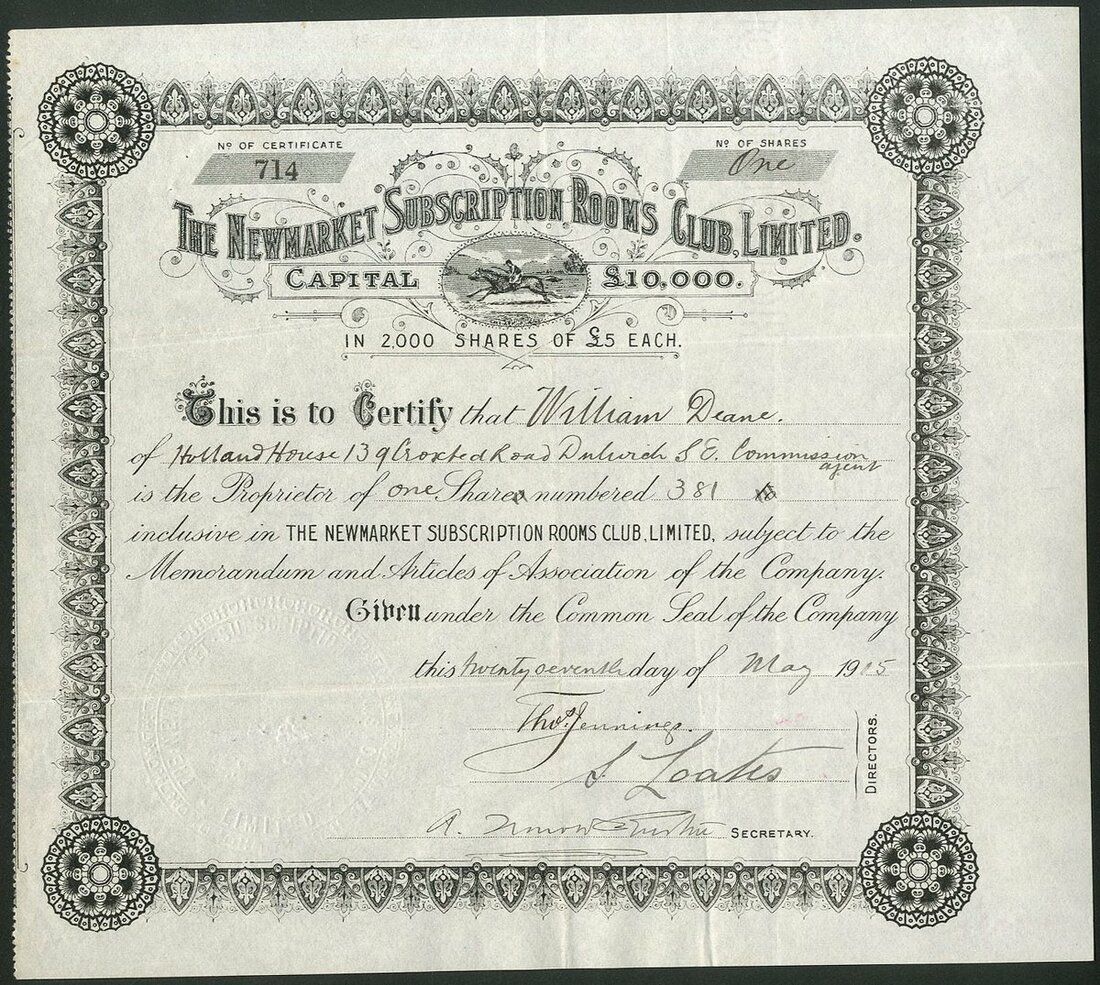 Great Britain: Newmarket Subscription Rooms Club Limited, £5 shares, 19[15], #714, small vignette of racehorse, ornate borders, black. Probably the best known horse racing institution next to Tattersalls, which was established in 1881 with close associations with the Jockey Club. Helped to found the committee to formulate the rules on betting at racecourses in 1899. Closed in 1981. Later the buildings were home to the National Horseracing Museum. GVF and rare, the only example known to us.