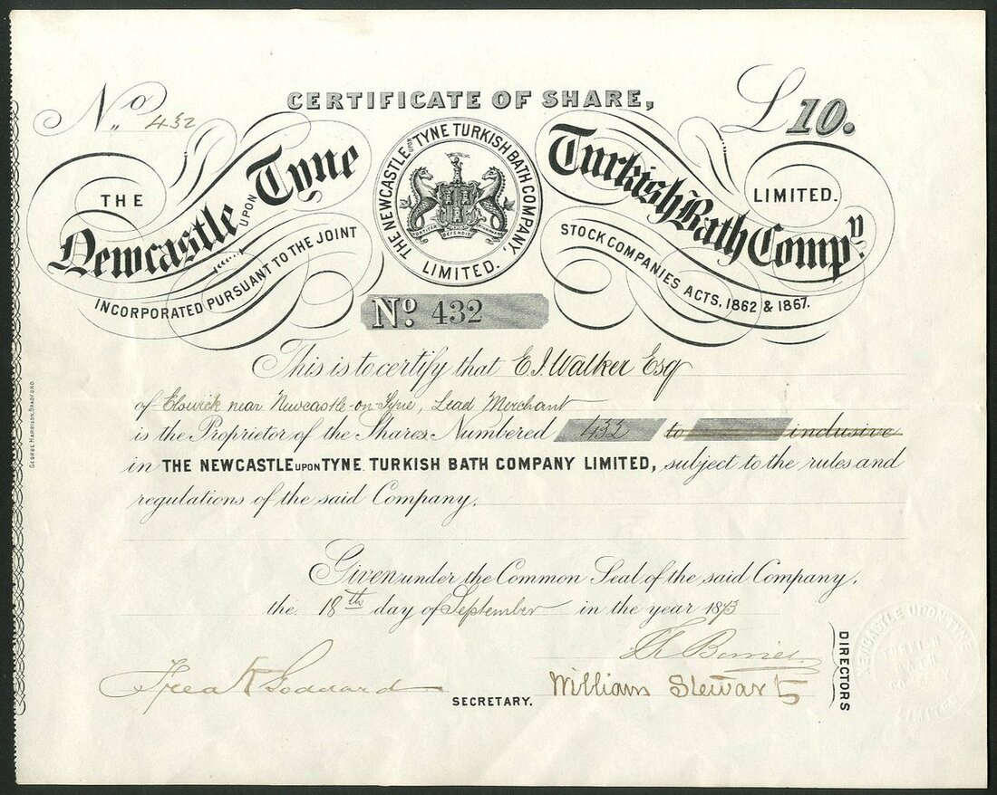 Great Britain: Newcastle upon Tyne Turkish Bath Co. Ltd., £10 share, 18[73], #432, arms at top, black. GVF and scarce. First time at auction.