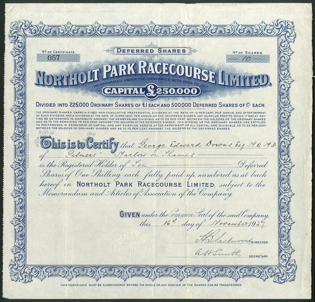 Great Britain: Northolt Park Racecourse Limited, 1/- deferred shares, 19[27], #057, ornate border, blue. Founded in 1927 by Viscount Lascelles and William Bass on a 147 acre site in this sleepy North London suburb. The first meeting took place in 1929. The course had some of the best facilities in the country; it planned to introduce the first photo-finish camera system in 1935, the first live radio broadcast in 1937 and in 1938 the BBC televised a race meeting for the second time. High overheads caused bankruptcy and the outbreak of war ceased all race meetings and unfortunately never recommemced after the war. GVF and rare.