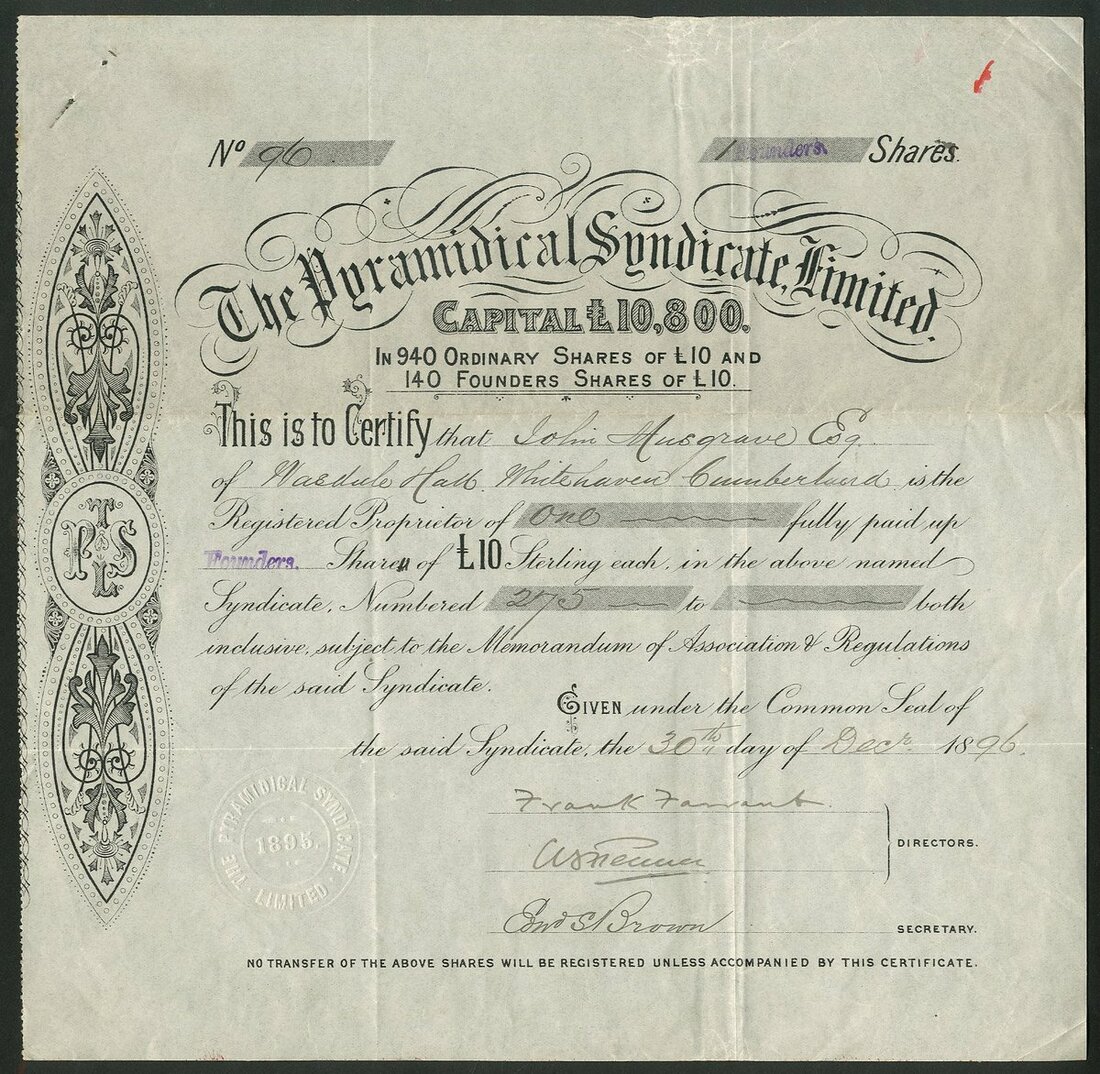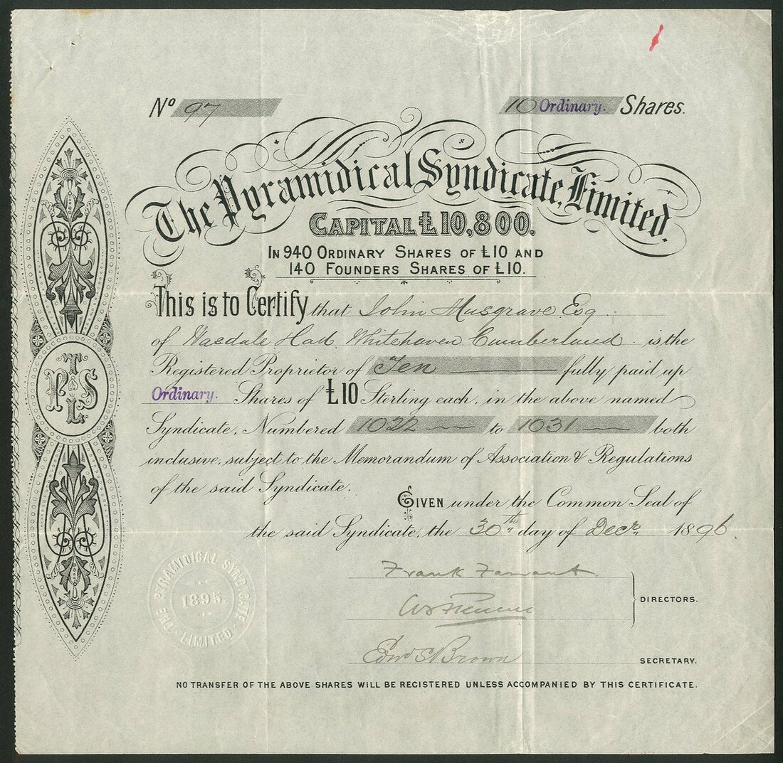Great Britain: Pyramidical Syndicate Ltd., a pair of certificates for £10 shares, the first ordinary shares, #97, the second for founders shares, #96, both 18[96], black with scrollwork. Run by William Darker Pitt, previously connected with the Blackpool Tower and its construction. A 'fairground' ride whereby a car was elevated to the top of a pyramidical track and then released. One was built at the Marine Park in Southend. The Pyramidical Railways did not prove that successful and Darker Pitt's financial schemes came into question. Both VF. (2)
