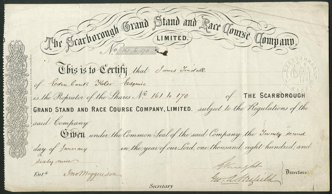 Great Britain: Scarborough Grand Stand and Race Course Company Limited, shares, 18[69], #161-70, scrollwork at left, black. The course was laid out in 1867 at Seamer Moor, moving from the old beach surface. The first meeting was held in 1868 and last in May 1907. A little grubby but VF and very rare.