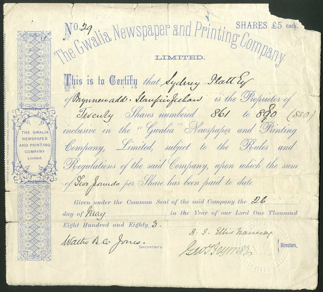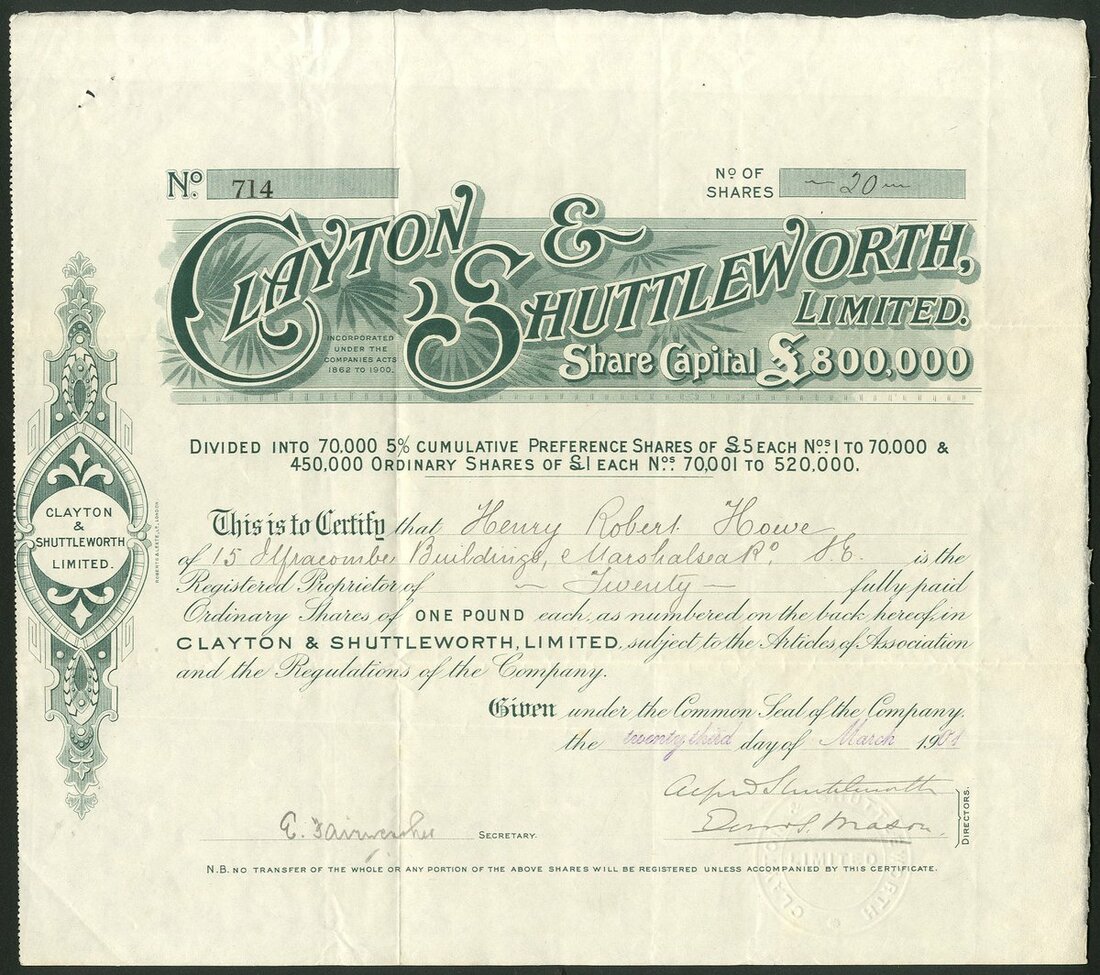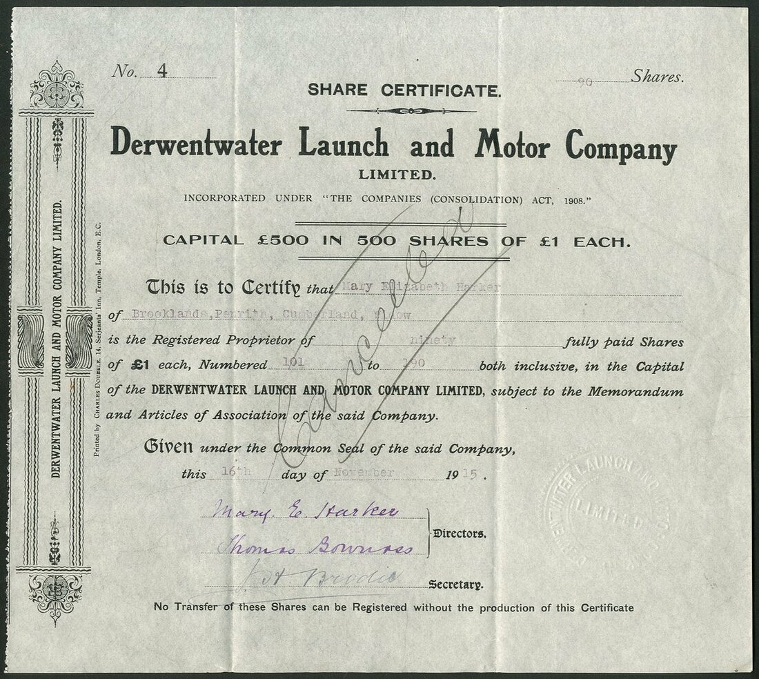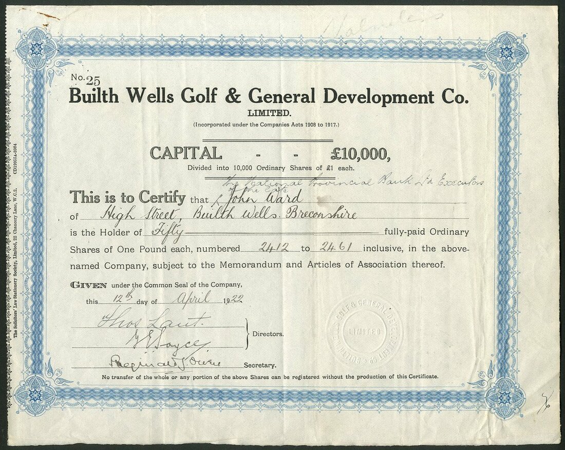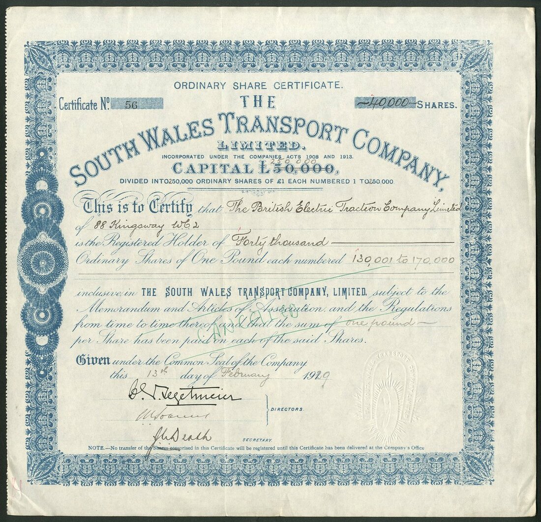 Great Britain: A Miscellaneous group comprising, Derwentwater Launch and Motor Company Limited, £1 shares, 19[15], #4, cancelled, rare; Builth Wells Golf & General Development Co. Ltd., £1 shares, 19[22], #22; Gwalia Newspaper and Printing Company Ltd., £5 shares, 188[3], #29, damaged; South Wales Transport Co. Ltd., £1 shares, 191[29], #56, and, Clayton & Shuttleworth Ltd., £1 ordinary shares, 19[01], #714. VF unless stated (5).