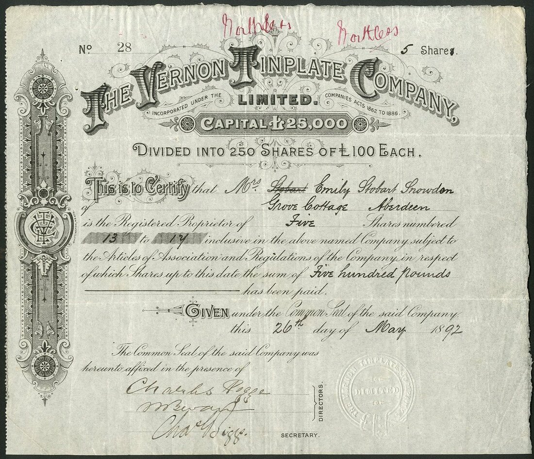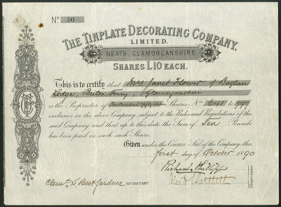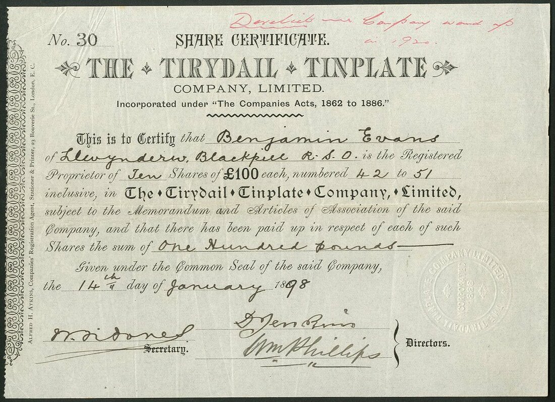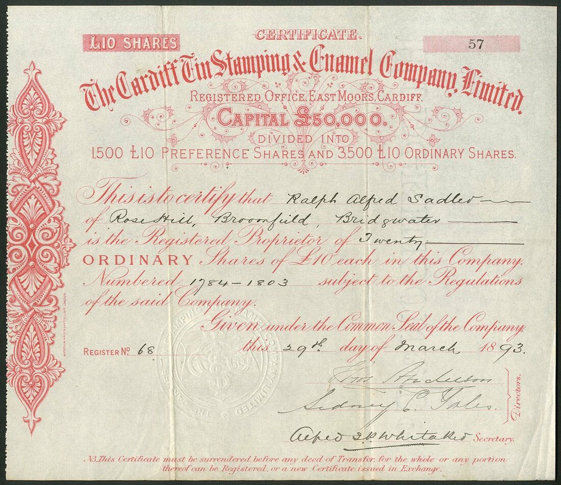 Great Britiain: A small group of South Wales Tinplate companies, comprising; Cardiff Tin Stamping & Enamel Co. Ltd., £10 shares, 18[93], #57, red; Tinplate Decorating Co. Ltd., £10 shares, 18[90], #50, black; Tirydail Tinplate Co. Ltd., £100 shares, 188[98], #30, black, and Vernon Tinplate Co. Ltd., £100 shares, 18[92], #28, black. All VF or thereabouts. (4)