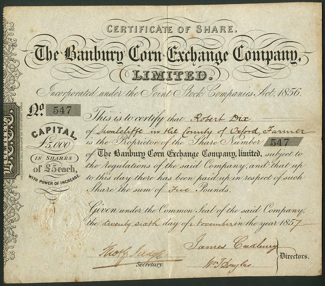 Great Britain: Banbury Corn Exchange Company Limited, £5 share, 185[7], #547, black. Some minor foxing otherwise VF and rare. First time at auction.