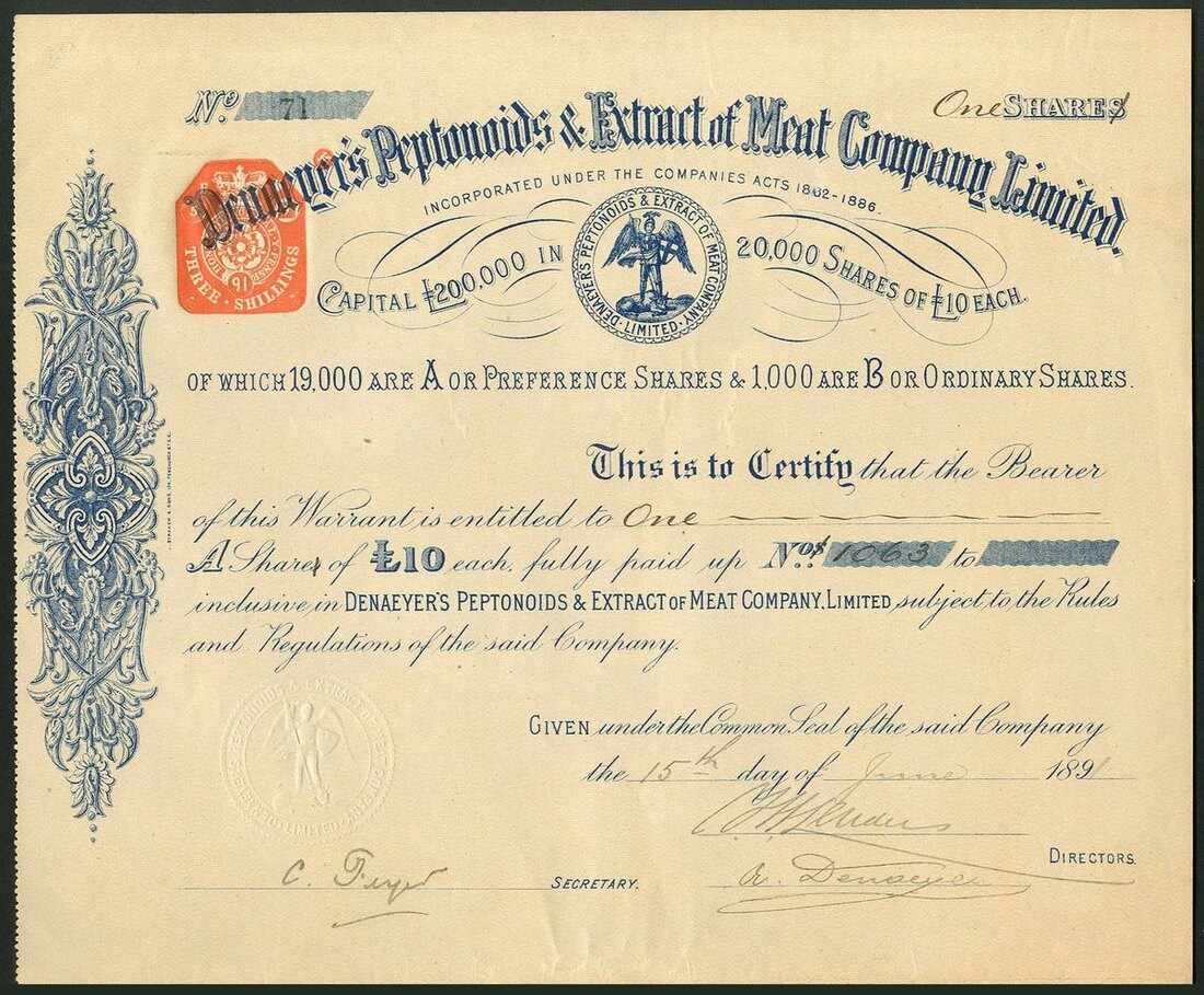 Great Britain: Denaeyer's Peptonoids & Extract of Meat Co. Ltd., £10 'A' preference shares, 189[1], #71, blue printing with scrollwork, with coupons. EF.