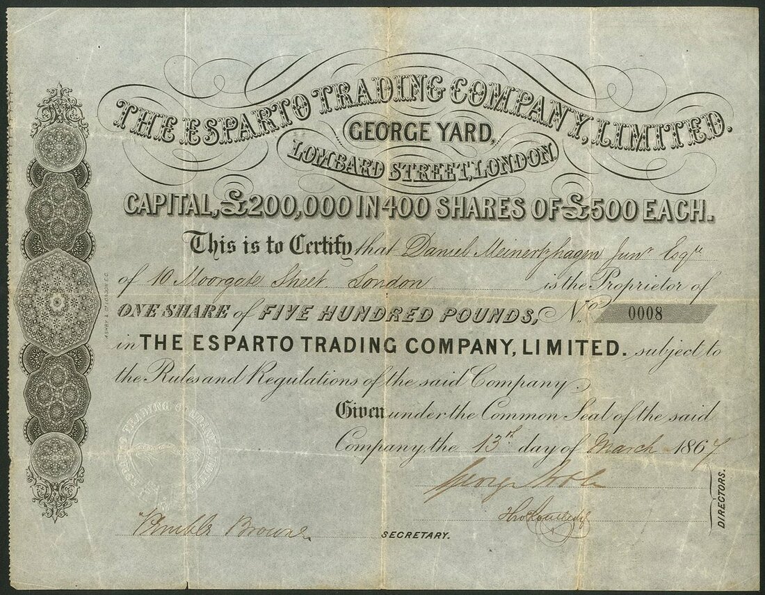 Great Britain: Esparto Trading Co. Ltd., £500 share, 186[7], #0008, signed by Thomas Routledge as director, scrollwork at left, black. Routledge had developed a method of using Esparto grass to make paper in the 1850's and had dealings with the foremost manufacturers such as Dickinson. Most of the supply came from Spain or North Africa. The company appears to have survived well into the 1960's but further information is not available. Routledge also fought long and hard with the Government for the removal of duty on paper which was finally achieved. Weak on folds, very fragile paper, AVF.