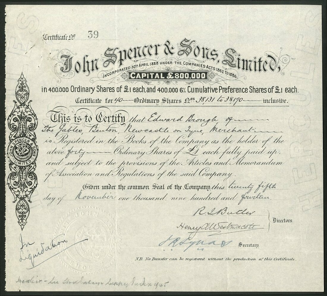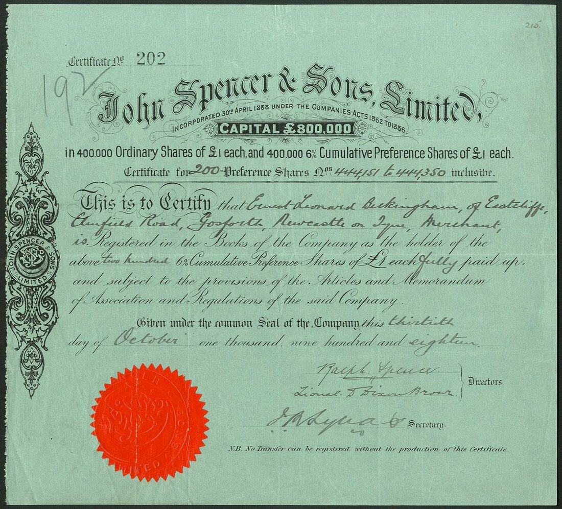 Great Britain: John Spencer & Sons Ltd., pair of certificates, ordinary £1 shares, 19[14], #39, black printing, and 6% preference shares of £1 each, 19[18], #202, black on green, red paper seal. Registered 30th April 1888 to acquire iron and steel manufacturers of the same name based at the Newburn Steel Works, Newcastle upon Tyne. The business was founded in 1810 by John Spencer. Both VF (2).