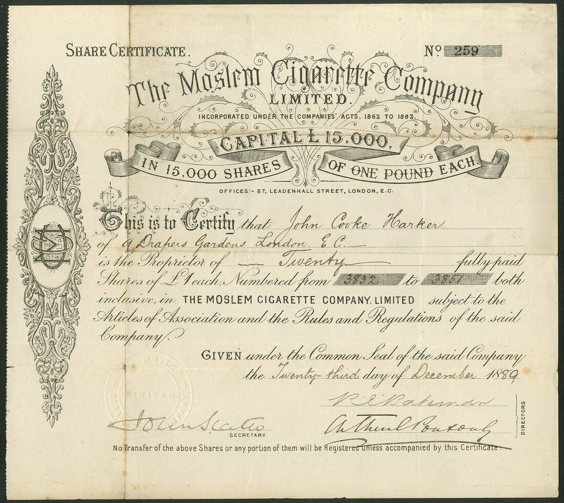 Great Britain: Moslem Cigarette Company Limited, £1 shares, 18[89], #259, scrollwork left, black. Wound up in 1894. Folds but VF and rare.