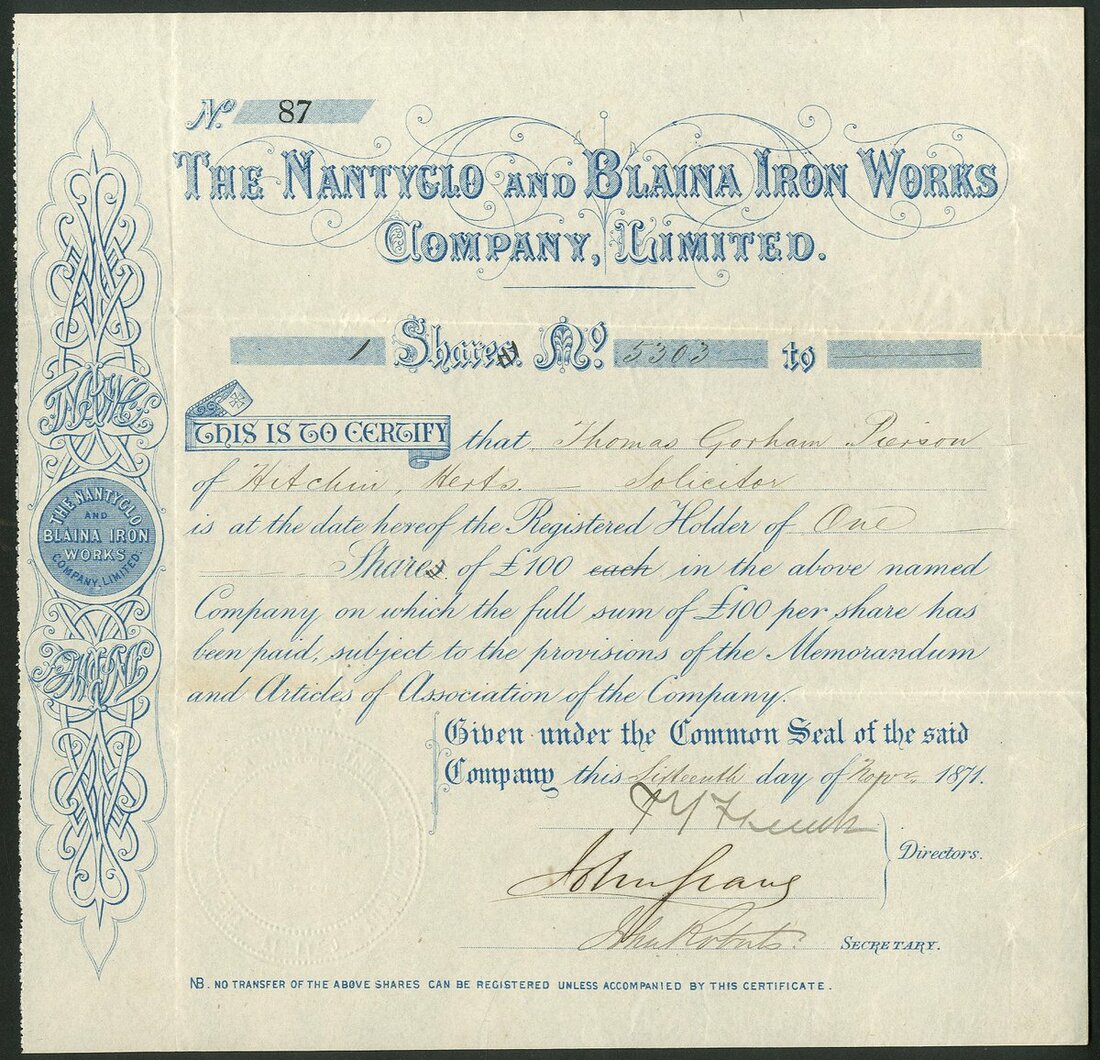 Great Britain: Nantyglo and Blaina Iron Works Co. Ltd., £100 shares, 1871, #87, decorative blue printing. Registered in 1871 on the merger of the Blaina Iron & Coal Company with the Nantyglo and Beaufort Ironworks. Closed in 1878. GVF.