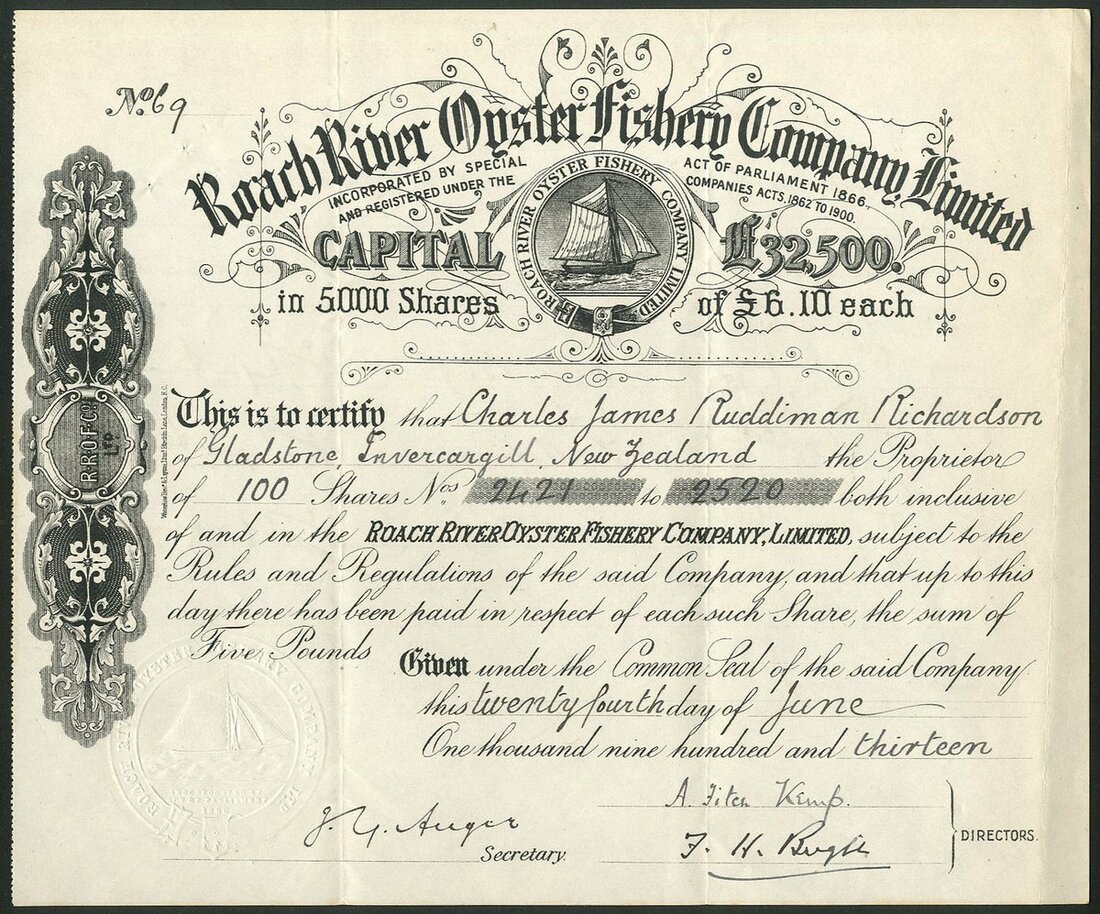 Great Britain: Roach River Oyster Fishery Company Limited, £6 10s shares, 19[13], #69, small vignette of fishing boat, black, printed by Waterlow, Bros & Layton. This Essex river is famous for its native oysters and has been subject to much legislation in recent years. GVF and rare. interesting subject.