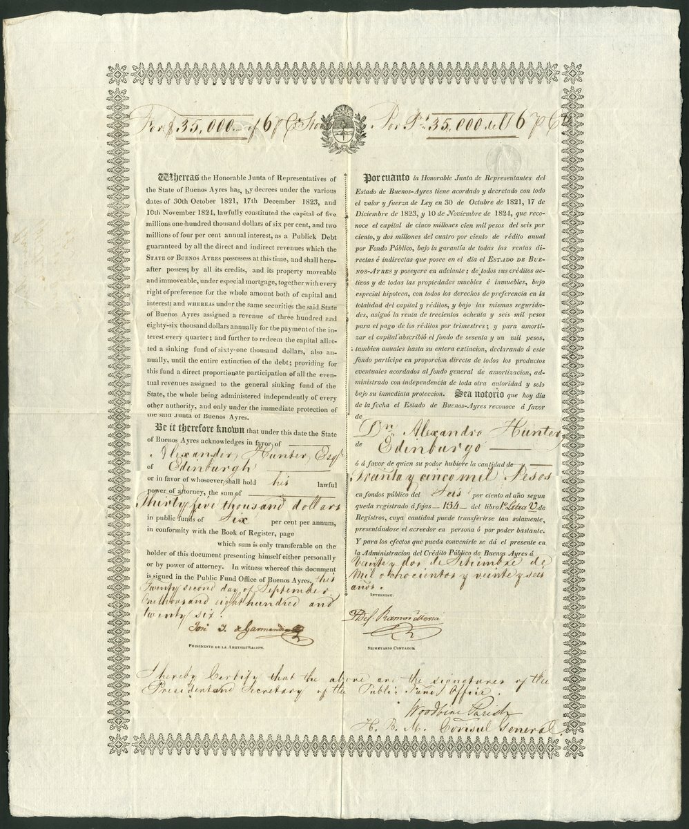 Argentina: State of Buenos Aires, [6]% loan, $[35,000] pesos, [1826], issued to Dr. Alexander Hunter of Edinburgh signed by Woodbine Parish as Consul General, large format piece with text in English and Spanish, black. Sir Woodbine Parish KCH (1796-1882), diplomat, traveller and scientist. Educated at Eton College, he took up his first diplomatic post in 1814, and was involved in events immediately following the defeat of Napoleon at Waterloo. In 1815 he went with the expedition that restored the Kingdom of Naples to the House of Bourbon after the defeat of Joachim Murat, then returned to Paris as a secretary with Lord Castlereagh's embassy that drafted the 1815 Treaty of Paris. He served as chargé d'affaires at Buenos Aires from 1825 to 1832. In this capacity, he signed the Treaty of Friendship, Commerce, and Navigation with Argentina on February 2, 1825, accompanying also official recognition by Great Britain of Argentinian independence. With Joseph Barclay Pentland, Parish surveyed a large part of the Bolivian Andes between 1826 and 1827. VF and scarce.