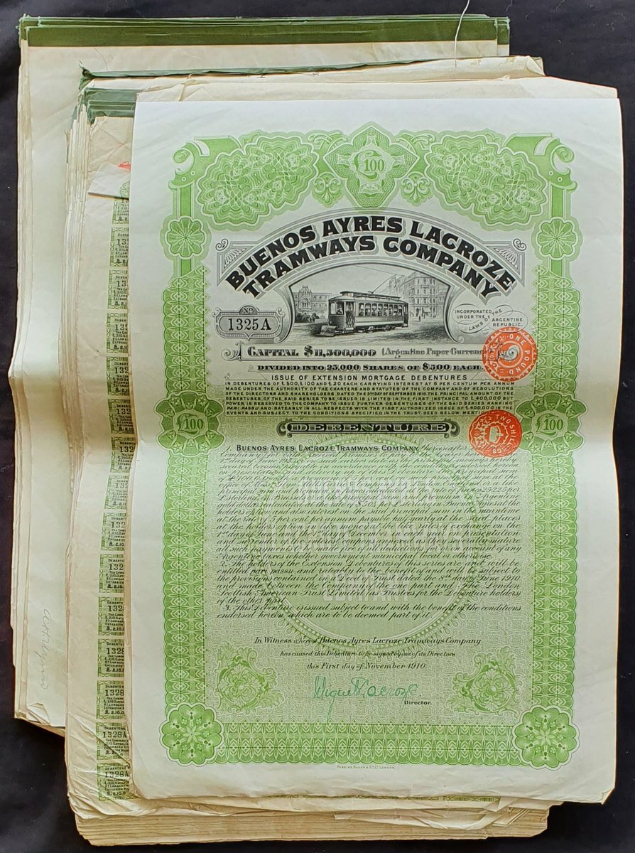 Argentina: Buenos Ayres Lacroze Tramways Company, 5% Extension Mortgage debentures, 1910, £100 bonds, 50 examples, tramcar at top, green, with coupons.
