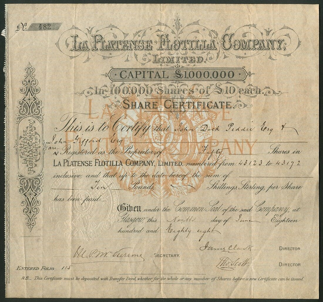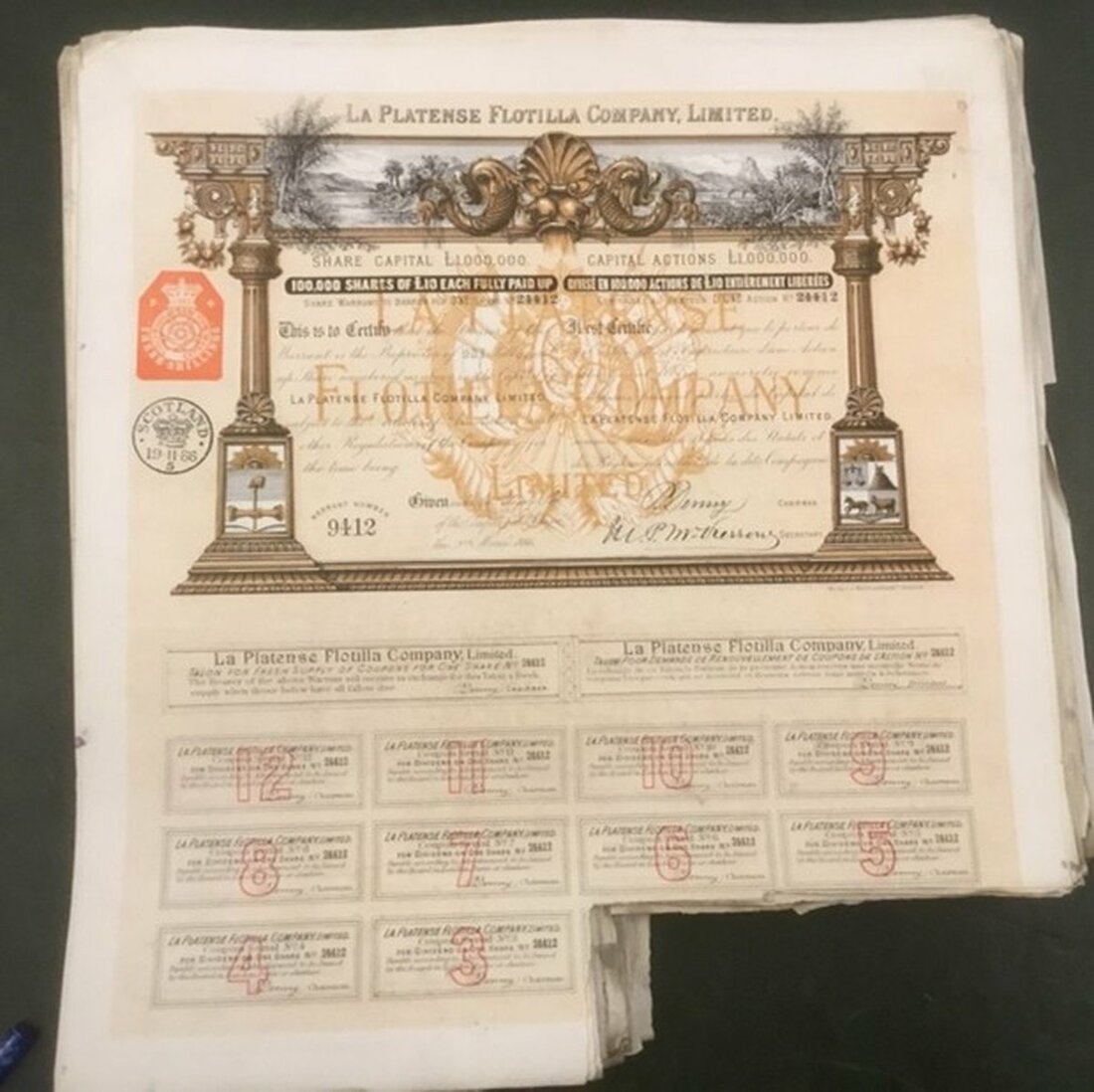 Argentina: La Platense Flotilla Company Limited, £10 shares, 1888, #482, black with buff underprint, together with a large group of 150 certificates for £10 share, Glasgow 1886, lovely architectural border with vignettes at top, with coupons. The frst rare. VF and EF (151).