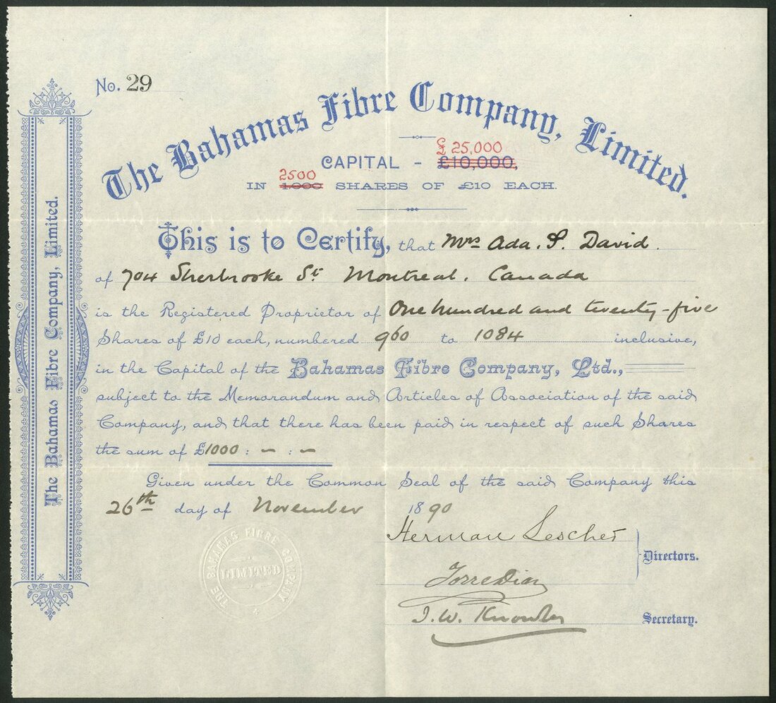 Bahamas: Bahamas Fibre Company Limited, £10 shares, 18[90], #29, signed by Herman Lescher and the Count de Torre Diaz as directors, blue. The company was formed to extract fibre from the pita plant, a native of the island and soon many thousands of acres were planted for the purpose. GVF and rare.
