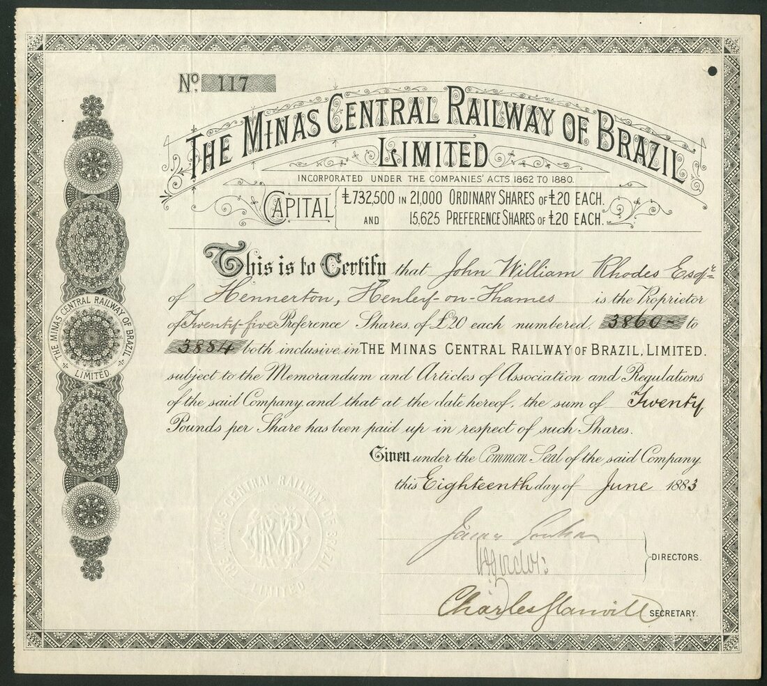 Brazil: Minas Central Railway of Brazil Limited, £20 preference shares, 188[3], #117, scrollwork at left, black. GVF and rare.