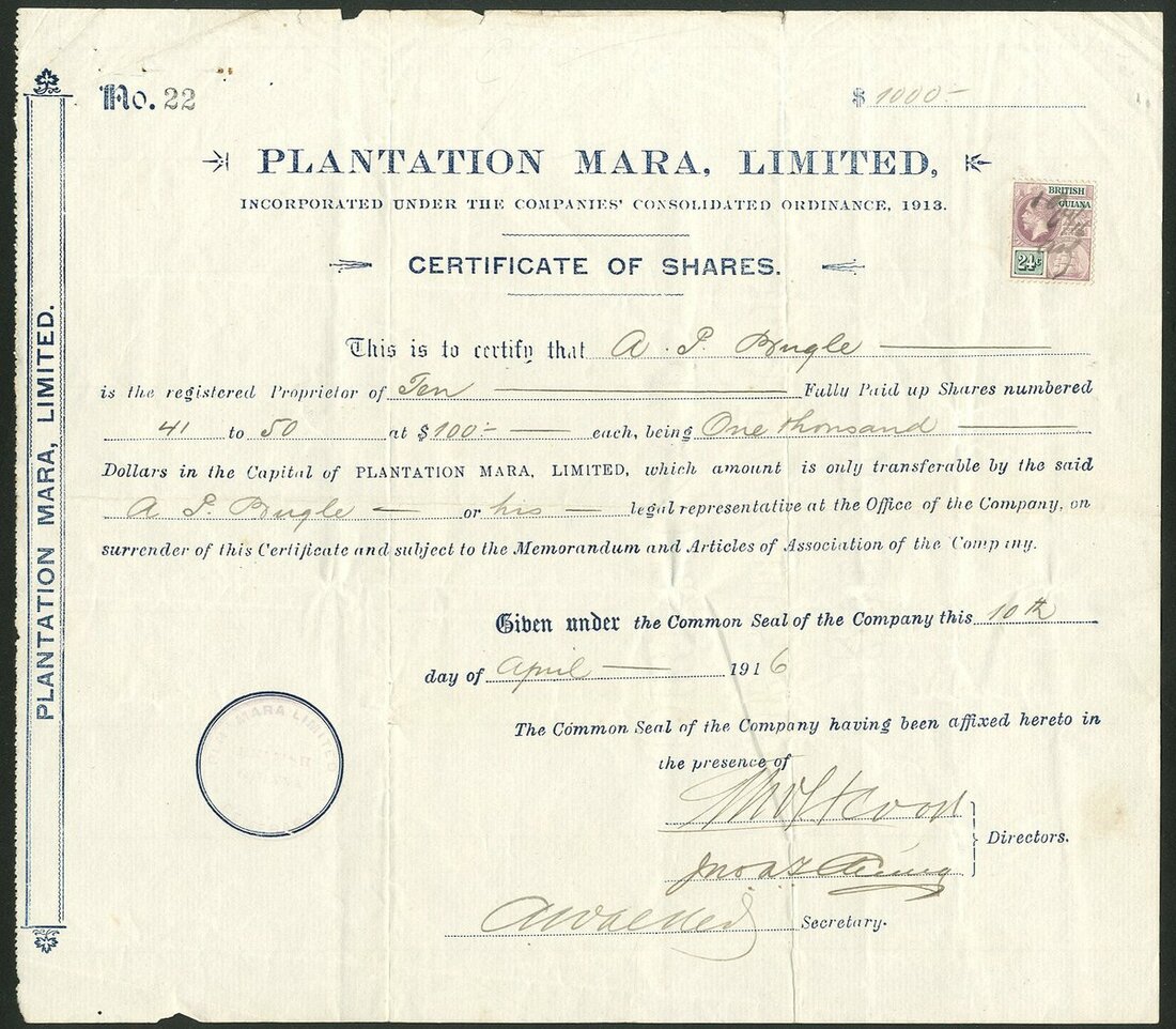 British Guiana: Plantation Mara, Limited, $100 shares, 191[6], #22, blue, 24c postage stamp attached. A couple of edge chips but VF and an extremely rare locally registered piece.