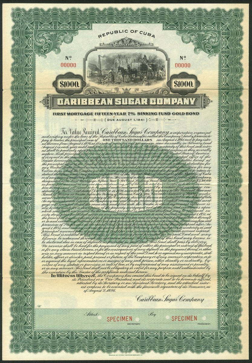 Cuba: Caribbean Sugar Company, First Mortgage 15-Year 7% Sinking Fund Gold Bond, 1926, a specimen bond for $1000, from the ABNCo. archives, cutting sugar cane at top, green and black, with coupons, overprinted SPECIMEN. Sold to the Baragua Sugar Estates in 1951 but with the land still subject to these mortgage bonds. The land was nationalised by the Cuban Government in 1960 leaving bondholders to make claims with the Foreign Claims Settlement Commission. VF-EF and rare.