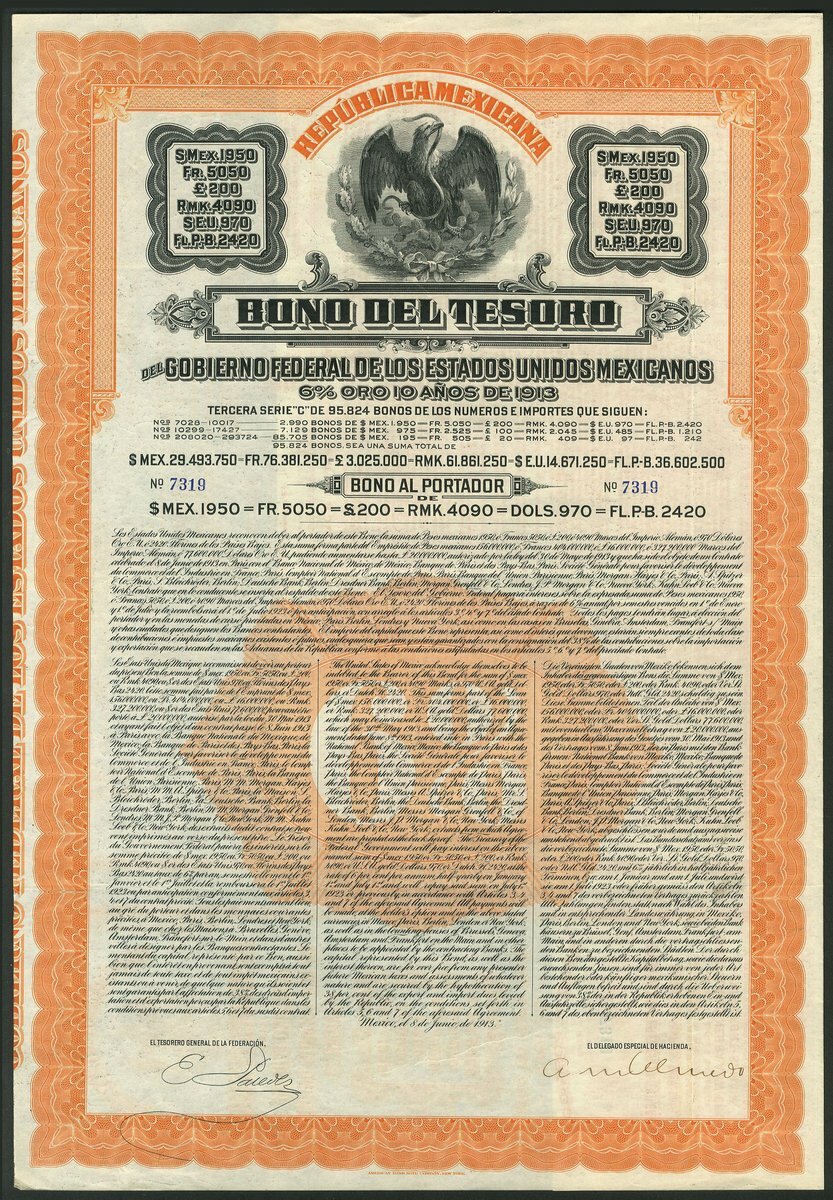 Mexico: 1913 6% Treasury Gold Loan, bond for £200, #7319, eagle at top, range and black, with coupons. Together with Russia, Chemin de Fer de Riazan-Ouralsk, 500 francs, 1914. GVF (2).