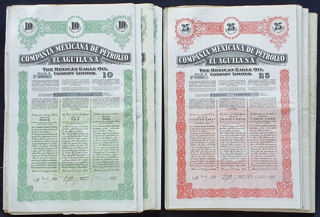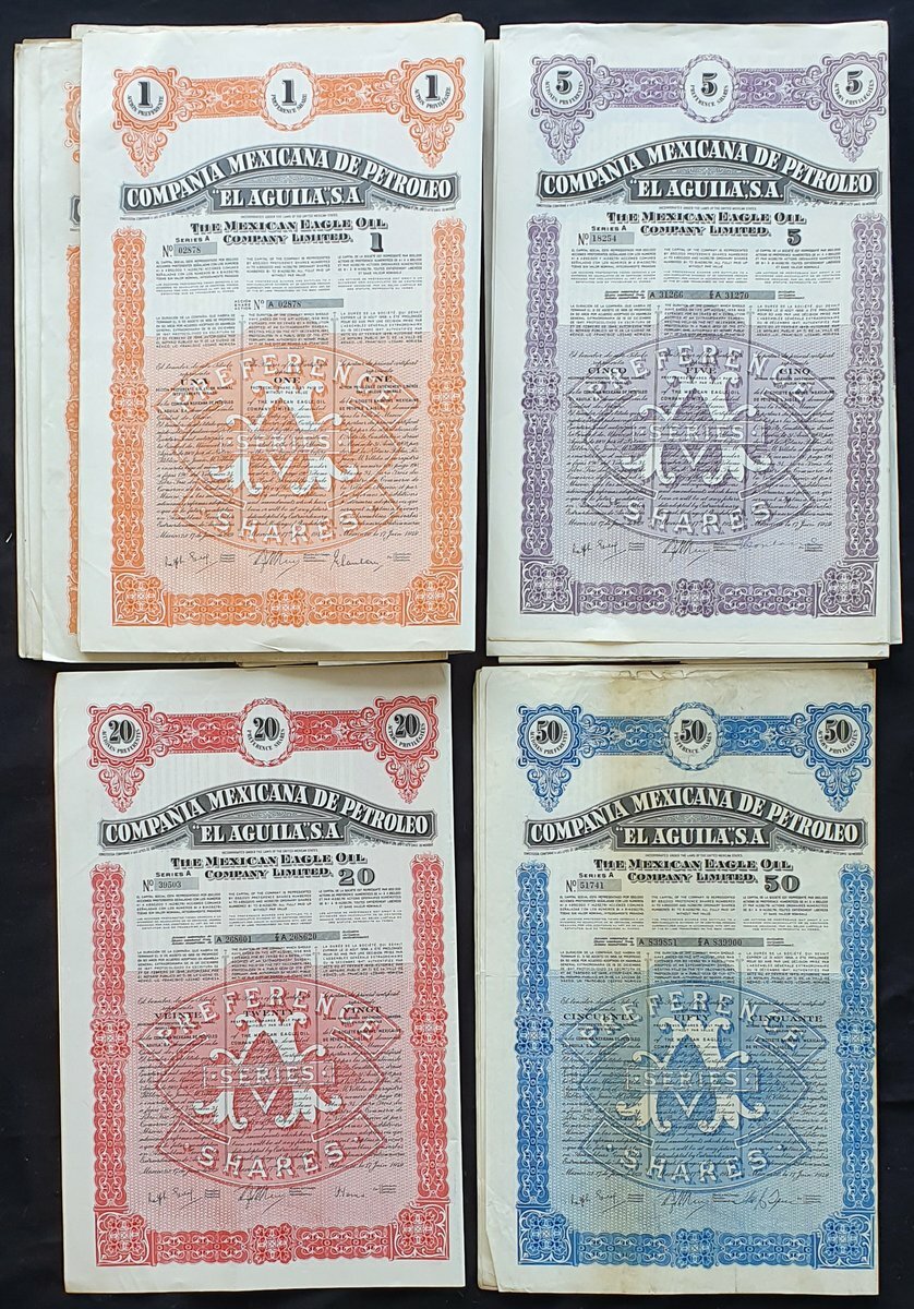 Mexico: Compañia Mexicana de Petroleo "El Aguila" S.A. (Mexican eagle Oil Co. Ltd.), a large group of share certificates, all dated 1949, comprising 1 preference share, orange (92), 5 preference shares, mauve (31), 20 preference shares, red (4) and 50 preference shares, blue (7); 1 ordinary share, orange (24), 5 ordinary shares, mauve (1), 10 ordinary shares, green (80) and 25 ordinary shares, red (71), all with coupons. Many EF (310 ).
