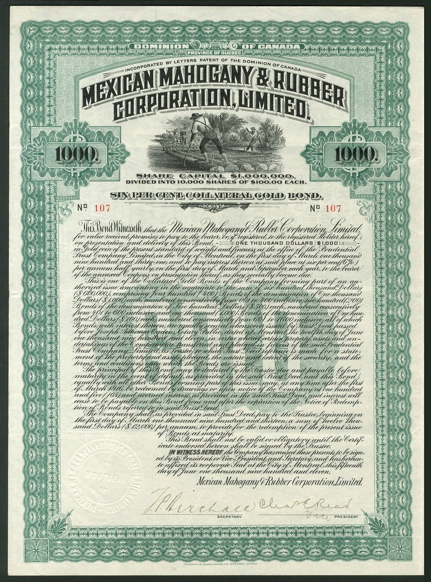 Mexico: Mexican Mahogany & Rubber Corporation Ltd., 6% collateral gold bond for $1000, 1911, #107, men sailing log rafts down river, ornate border, green and black, with coupons. Offices in Montreal, Canada, operations in Mexico. GVF.