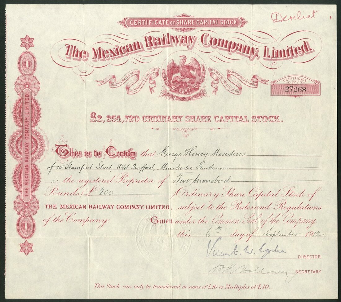 Mexico: Mexican Railway Co. Ltd., a series of 3 certificates for ordinary shares, 19[12], #27268, red; 8% First Preference stock, 19[14], #34465, black on pink paper, and, 6% Second Preference shares, 19[19], #18450, black on green paper, all with Mexican eagle top centre. The second with spike hole top left otherwise all VF and very scarce despite the high serial numbers (3).