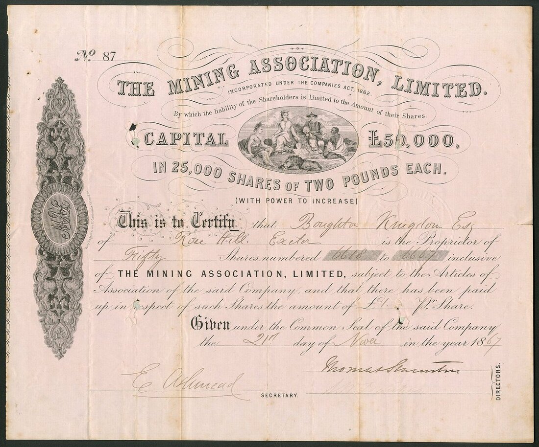 Nicaragua & Australia: Mining Association Limited, £2 shares, 18[67], #87, vignette in centre of various peoples, black on pink paper. A general company which floated the Australian United Goldf Mining Company and more importantly the East Javali and Pavon Gold & Silver Mining Company in Nicaragua. Creased ewith some separation and splits which have been repaired on the reverse. Fine.