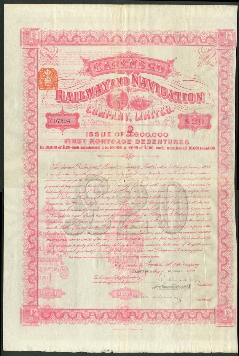 Venezuela: Carenero Railway & Navigation Co. Ltd., First Mortgage debenture for £20, 1889, #7394, large format piece with ornate border, red, with coupons. VF and rare.