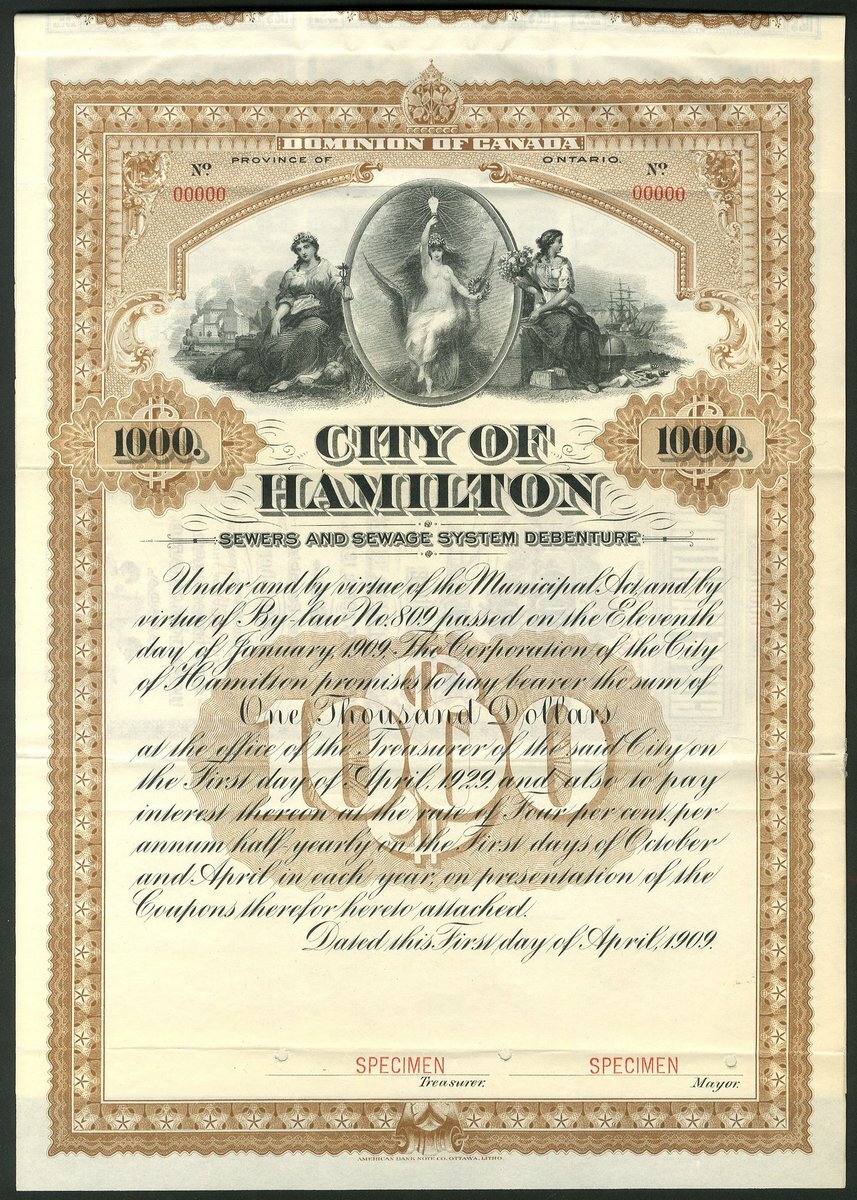 Canada: City of Hamilton, Sewers and Sewage System Debenture, SPECIMEN $1000, 1909, allegorical females at top, ornate border, brown and black, with coupons. Repaired tear to right edge, otherwise VF.
