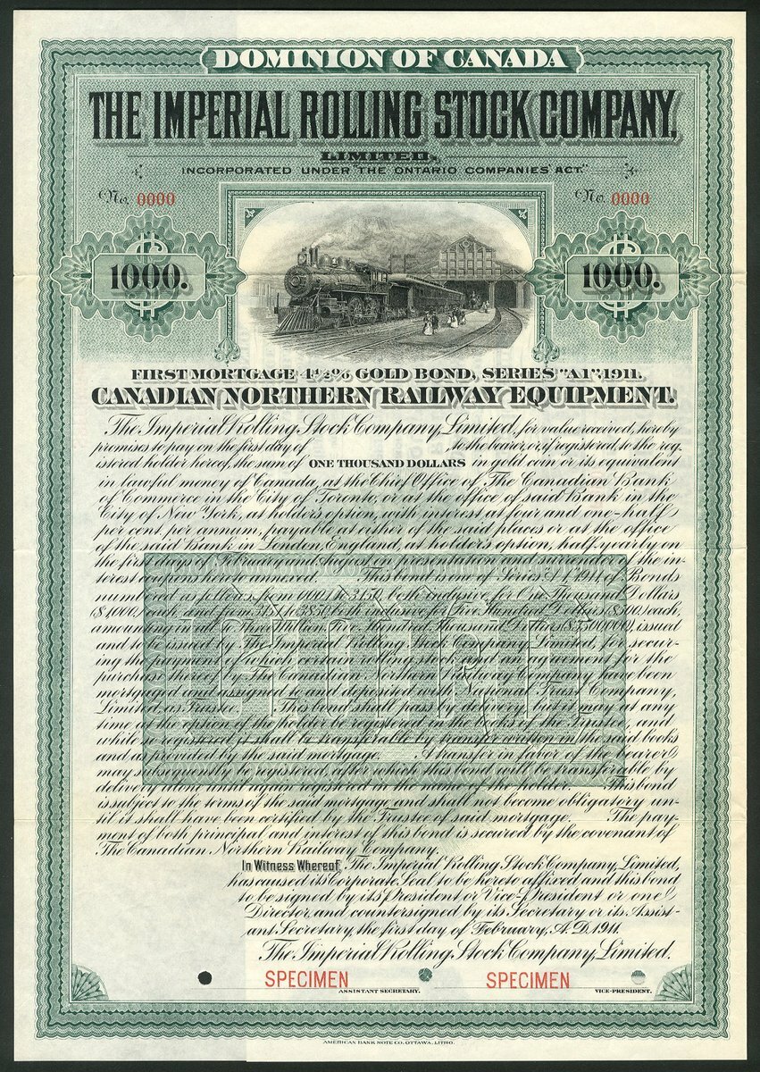 Canada: Imperial Rolling Stock Company Limited, Ontario, a specimen bond for $1000, 1911, numbered 0000 and overprinted SPECIMEN in red, steam train at top, green and black, with coupons. AEF and rare. No issued examples have been seen.