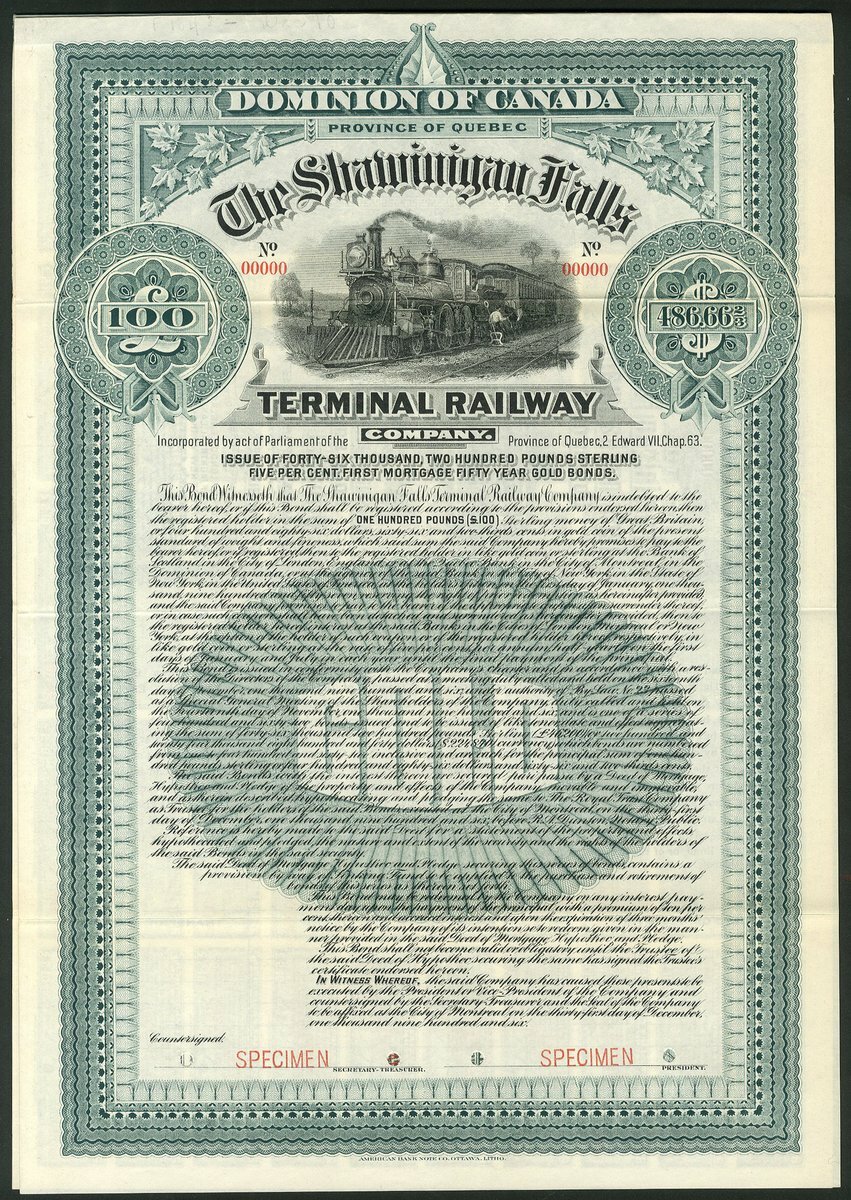 Canada: Shawinigan Falls Terminal Railway Company, a specimen bond, 1906, for £100, from the ABNCo. archives, steam train at top, green and black, overprinted specimen, with coupons. GVF and rare. No issued examples have been seen.
