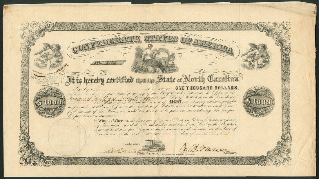 Confederate States of America: State of North Carolina, 8% Loan, 1862, redeemable in 1882, $1000, #3104, dated 18[62], signed by Zebulon Baird Vance as Governor, allegorical figures, black (Criswell 62L), with coupons. VF and scarce.