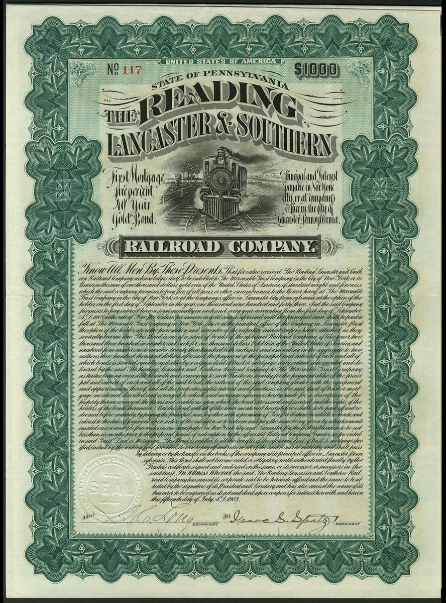 U.S.A.: A Group of Pennsylvania Railroad bonds, comprising Reading, Lancaster & Southern Railroad Co., $1000 bond, 1903, #117; Philadelphia and Easton Railway Co., $1000 bond, 1904, #492; Philadelphia & Reading Railroad Co., $1000 bond, 1882, #25058, and, Philadelphoa, Newtown and New York Railroad Co., $500, 1873, #2265, signed and with seal but not signed by the trustee. Not cancelled. VF-EF (4).