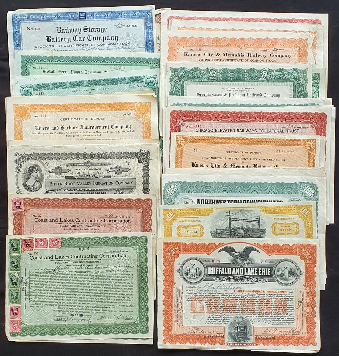 U.S.A.: A group of Railroad and miscellaneous companies, including Buffalo and Lake Erie Traction, 1916 (2); New York, New Haven and Hartford RR, 1937 (2); other titles inc ude Northwestern Pennsylvania Railway Company, Georgia Coast & Piedmont RR Co., Kansas City & Memphis Railway Co., Tampa and Jacksonville Railway Co., plus miscellaneous non railway companies. Many VF (60).