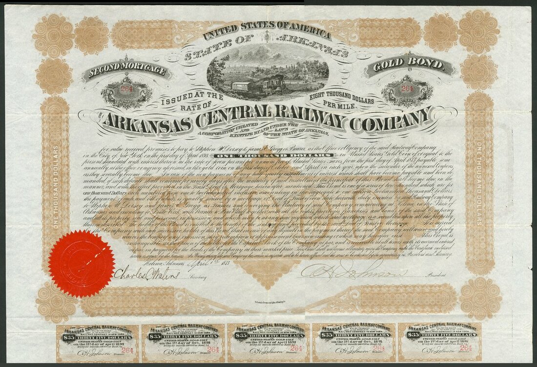 U.S.A.: Arkansas Central Railway Company, 7% Second Mortgage Gold Bond, 1873, $1000, #264, of 1200 issued, large format, steam train at top, brown and black, with coupons, red seal. VF and scarce.