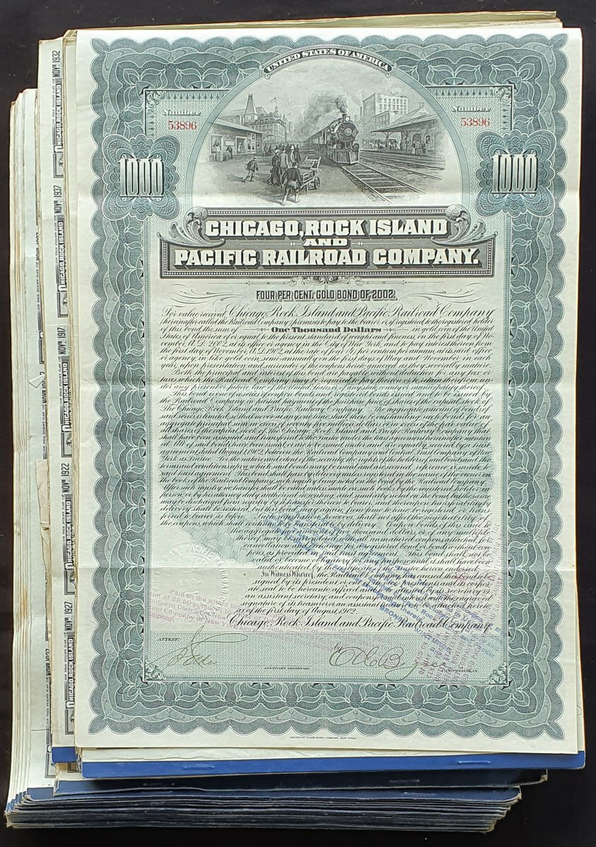 U.S.A.: Chicago, Rock Island and Pacific Railroad Company, a group of 43 4% Gold Bonds for $1000, 1903, steam train, steel grey, with coupons. VF and better (43).