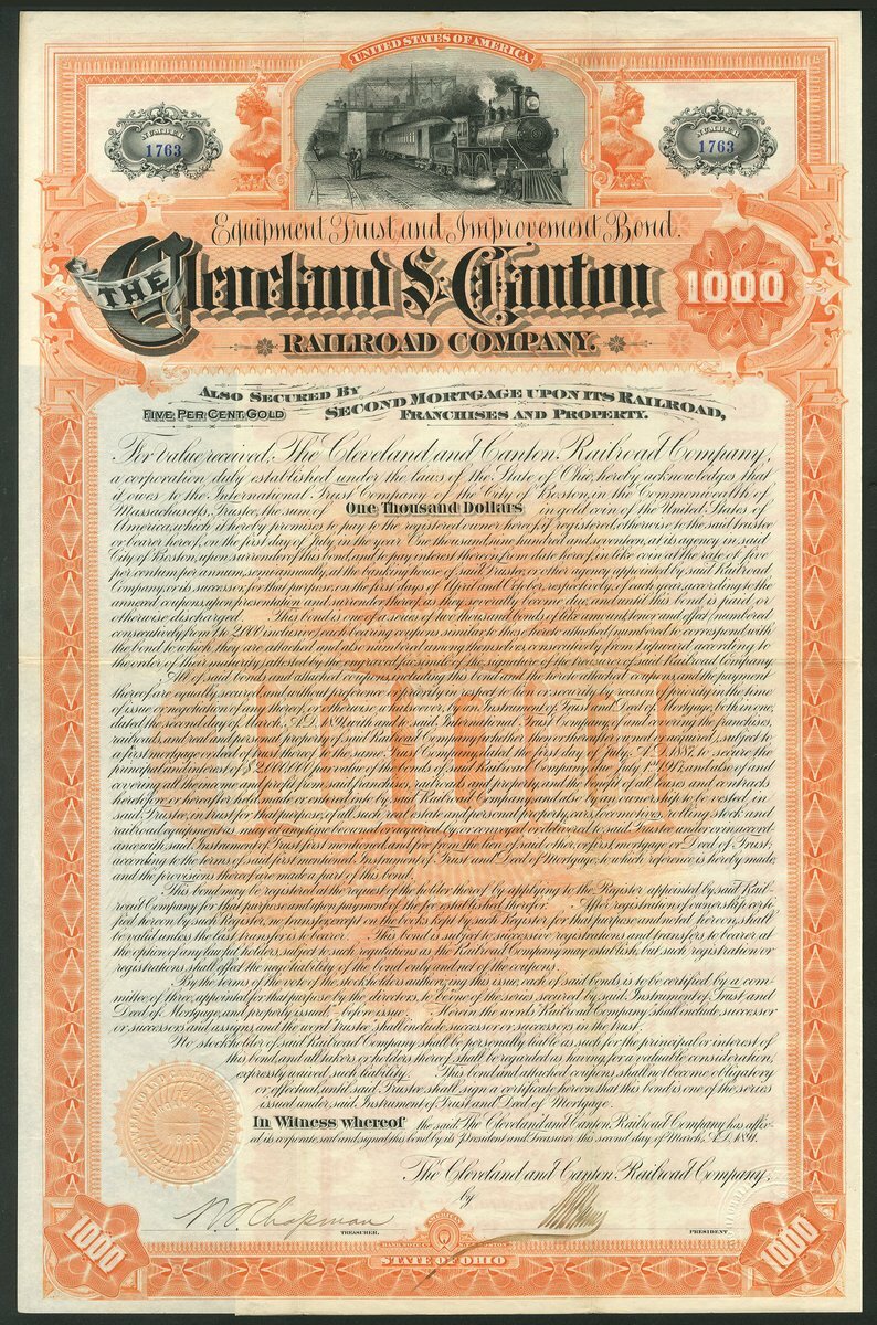 U.S.A.: Cleveland & Canton Railroad Company, Equipment Trust and Improvement 5% Gold Bond, 1891, $1000, #1763, attractive piece with steam train at top, orange and black, with coupons, NOT cancelled. VF.