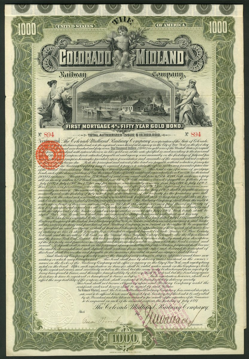 U.S.A.: Colorado Midland Railway Co., $1000 First Mortgage 4% Fifty Year Gold Bond, 1897, #894, large vignette of train at riverside station flanked by allegorical females, ornate border, black and green, with coupons. There were two distinct tranches of this loan, #1-6750 and 6751-10,000 with differing interest rates from the time of issue. The 2nd tranche has a red endorsement on the face reducing the rate to that of the 1st tranche. VF.