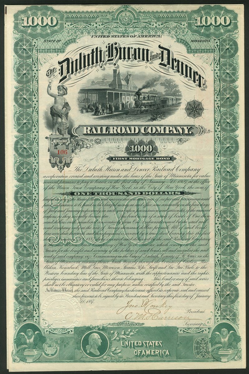 U.S.A.: Duluth, Huron and Denver Railroad Co. (MN), first mortgage bond for $1000, 1887, #106, train arriving at station at top, ornate border, green and black, with coupons. GVF.