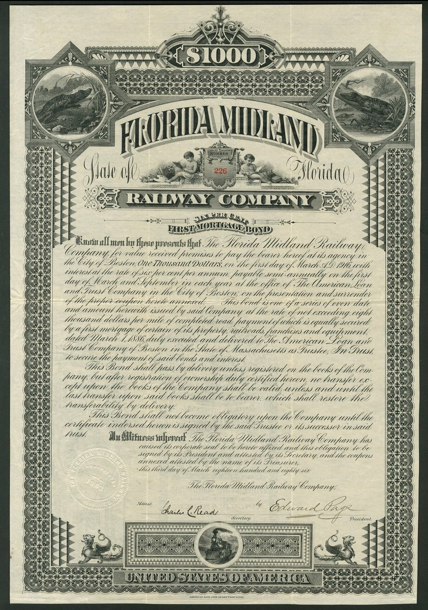 U.S.A.: Florida Midland Railway Company, 6% First Mortgage Bond, 1886, #226, $1000, 2 vignettes of alligators at top, small steam train at bottom, black, with coupons. GVF and scarce.