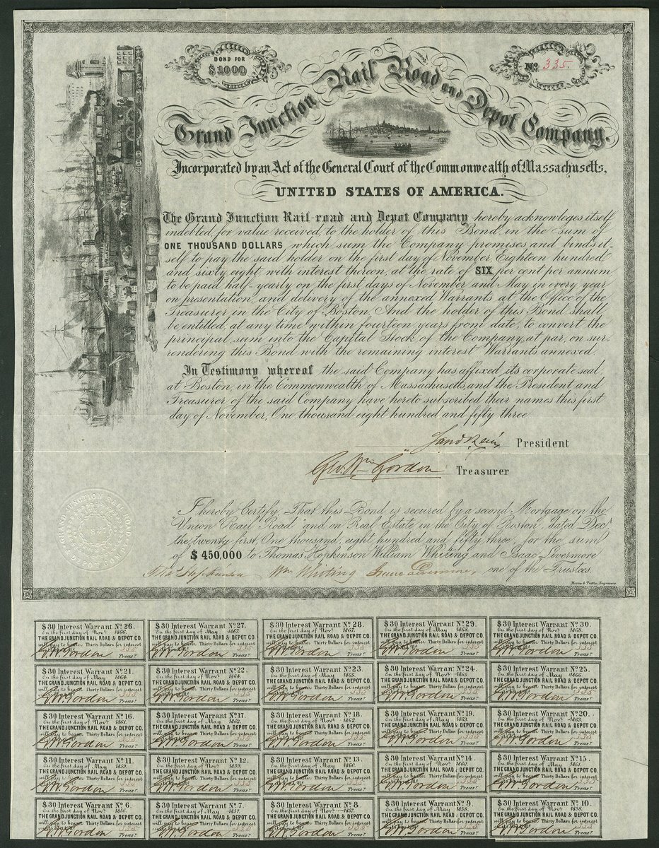 U.S.A.: Grand Junction Rail Road and Depot Company (MA), 6% loan, 1853, bond for $1000, #335, lovely panoramic vignette of port with paddle steamers to the left, black, with coupons, signed by 3 trustees at foot. GVF. NO RESERVE