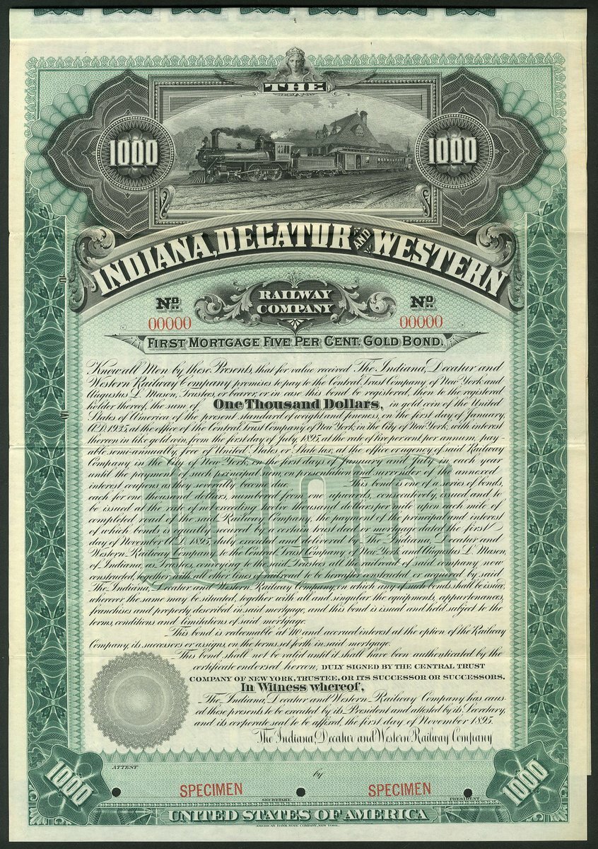 U.S.A: Indiana, Decatur and Western Railway Co., First Mortgage 5% Gold Bond, 1895, Specimen $1000, vignette of train at top, ornate border, green and black, coupons. GVF.