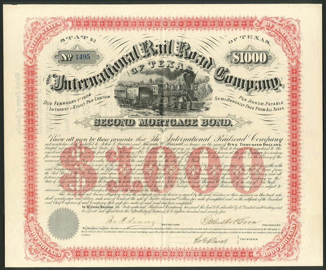 U.S.A.: International Rail Road Company of Texas, Second Mortgage bond for $1000, 1874, #1495, signed by Galusha Grow as President, large format piece with steam engine in centre, red and black, with coupons. GVF.