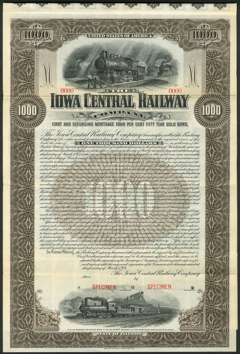 U.S.A.: Iowa Central Railway Company, First and Refunding Mortgage 4% 50-Year Gold Bond, 1901, a specimen bond for $1000 from the ABNCo. archives, steam train at top, brown and black, with coupons, overprinted SPECIMEN. Small tear at right edge, GVF and rare.